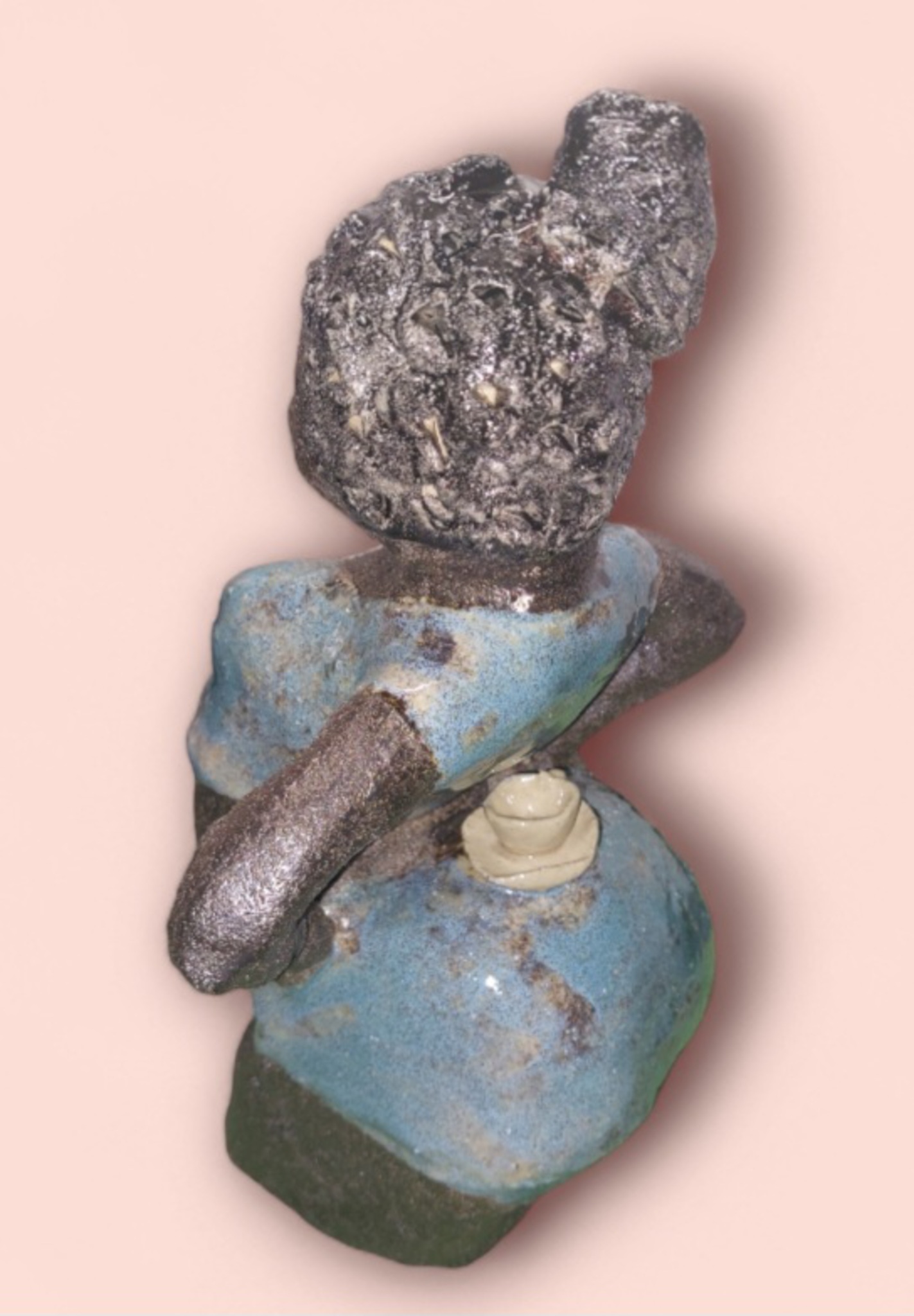 Dame met als grapje een kopje koffie op haar achterwerk. Ze heeft blauw geglazuurde kleding aan. Ik kreeg inspiratie door een reis naar Curaçao. Met voor mij nieuwe techniek met zand van Egmonds strand bewerkt, omdat ik in Egmond woon.