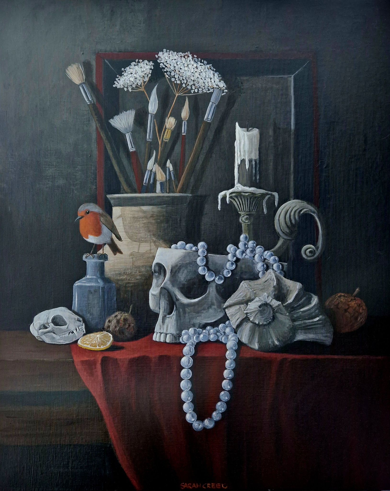 Sarah Creek schildert met acryl op canvas of linnen. Onderwerpen zijn portretten en stillevens. Sarah geeft les aan 55 talentvolle cursisten in een atelier aan huis.