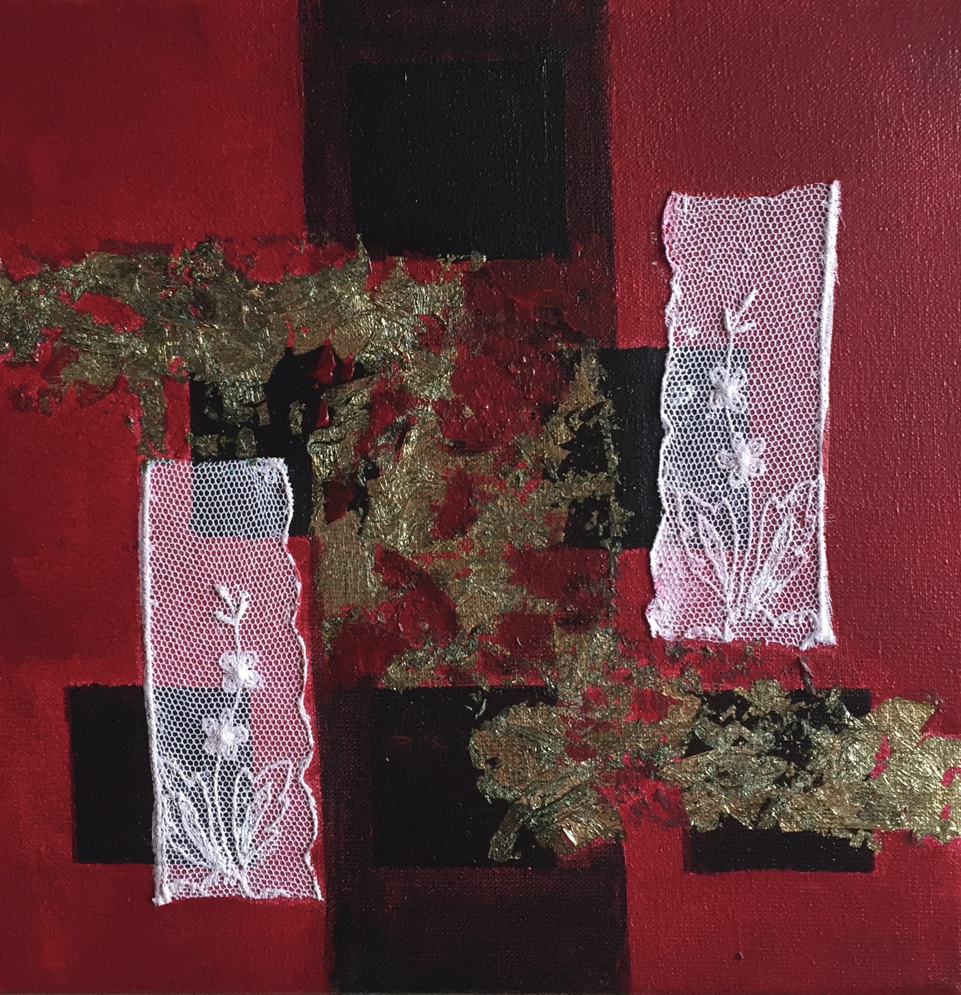 Een reeks van kleine werkjes in gemengde teckniek met kant en bladgoud. De symboliek gaat over de zachtheid, de dualiteit, het frivole en de kracht van het individu.
