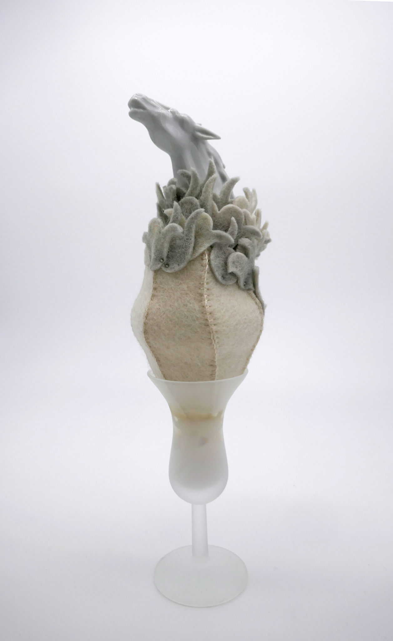 wol vilt, kapot keramiek, borduurzijde, foam, spelden, glas.