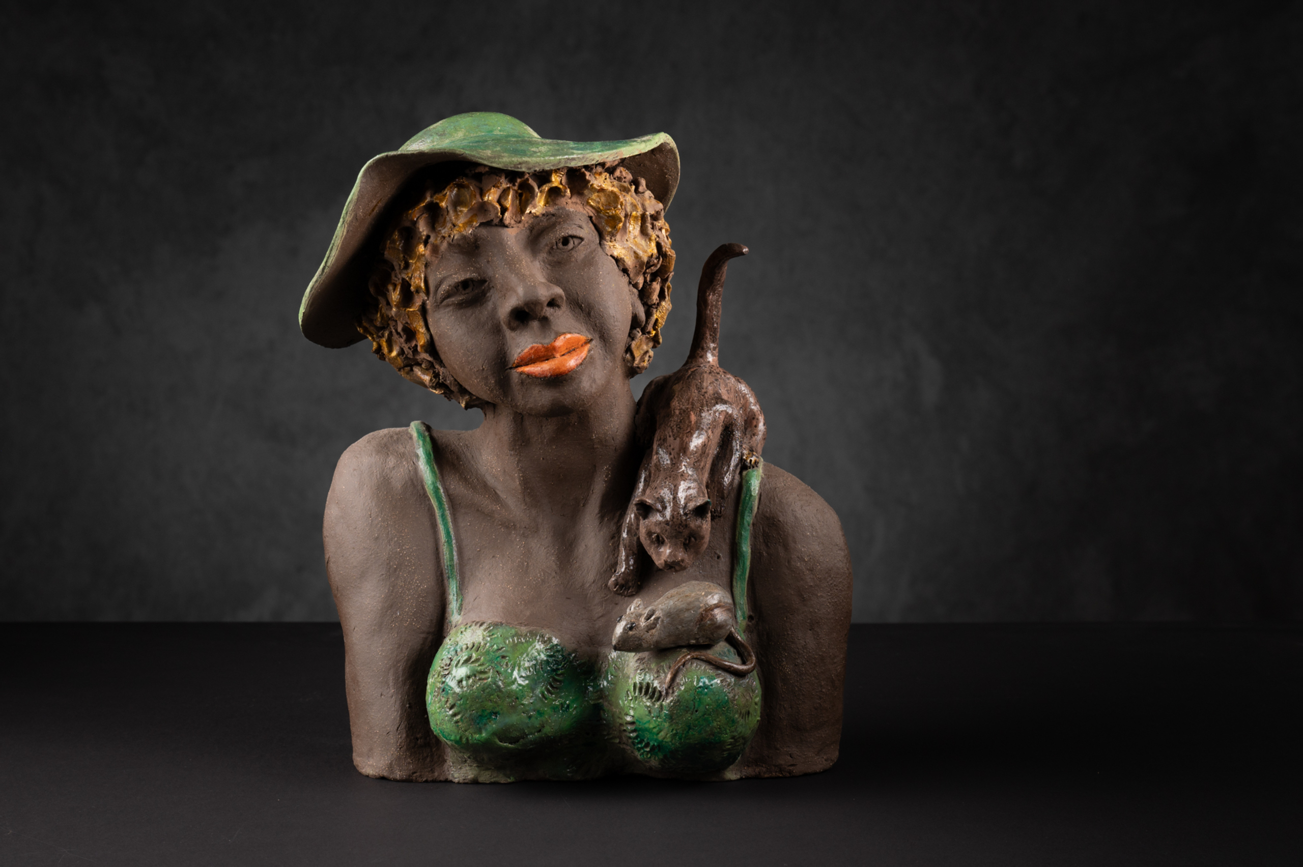 Dolores met het gezellige tafereeltje van de kat en de muis. Gemaakt van diepbruin bakkende aardewerk klei. Afgewerkt met glazuur, onderglazuur en wat goudverf in de haren.