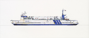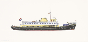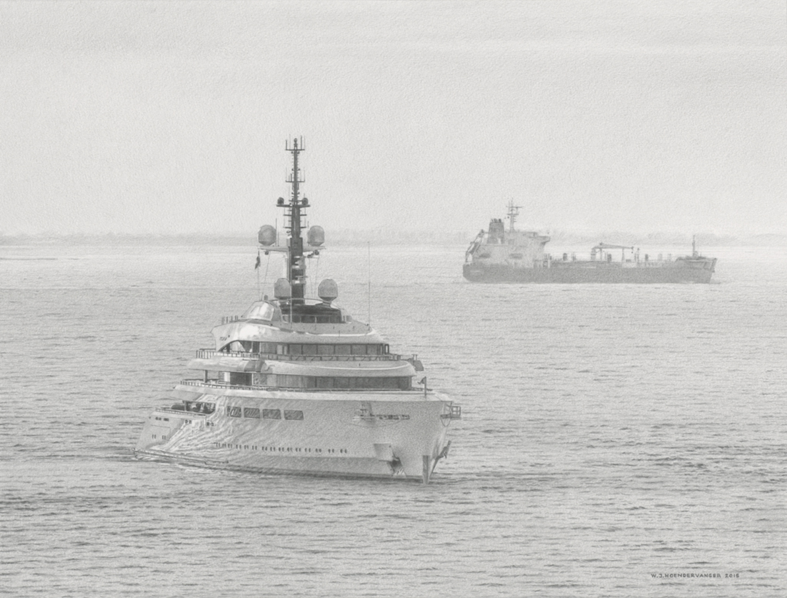 Het superyacht Vava II (2009) was begin 2015 op bezoek was bij Amels in Vlissingen voor een onderhoudsperiode. Ik heb het schip op deze tekening vastgelegd tijdens een proefvaart op de Westerschelde. Het superjacht is ver uit haar natuurlijke habitat van tropische oorden en azuurblauwe zeeën. Juist die enorme tegenstelling inspireerde mij tot het maken van deze potloodtekening. Dit wordt versterkt doordat ik op de achtergrond een tanker heb getekend; een typische Westerschelde beeld. Op deze bewolkte dag heeft de zon net een gaatje gevonden en weerkaatst de rimpeling van het water op de scheepshuid van het jacht. Op de achtergrond is de kustlijn van Zeeuws-Vlaanderen te zien. © W.J.Hoendervanger