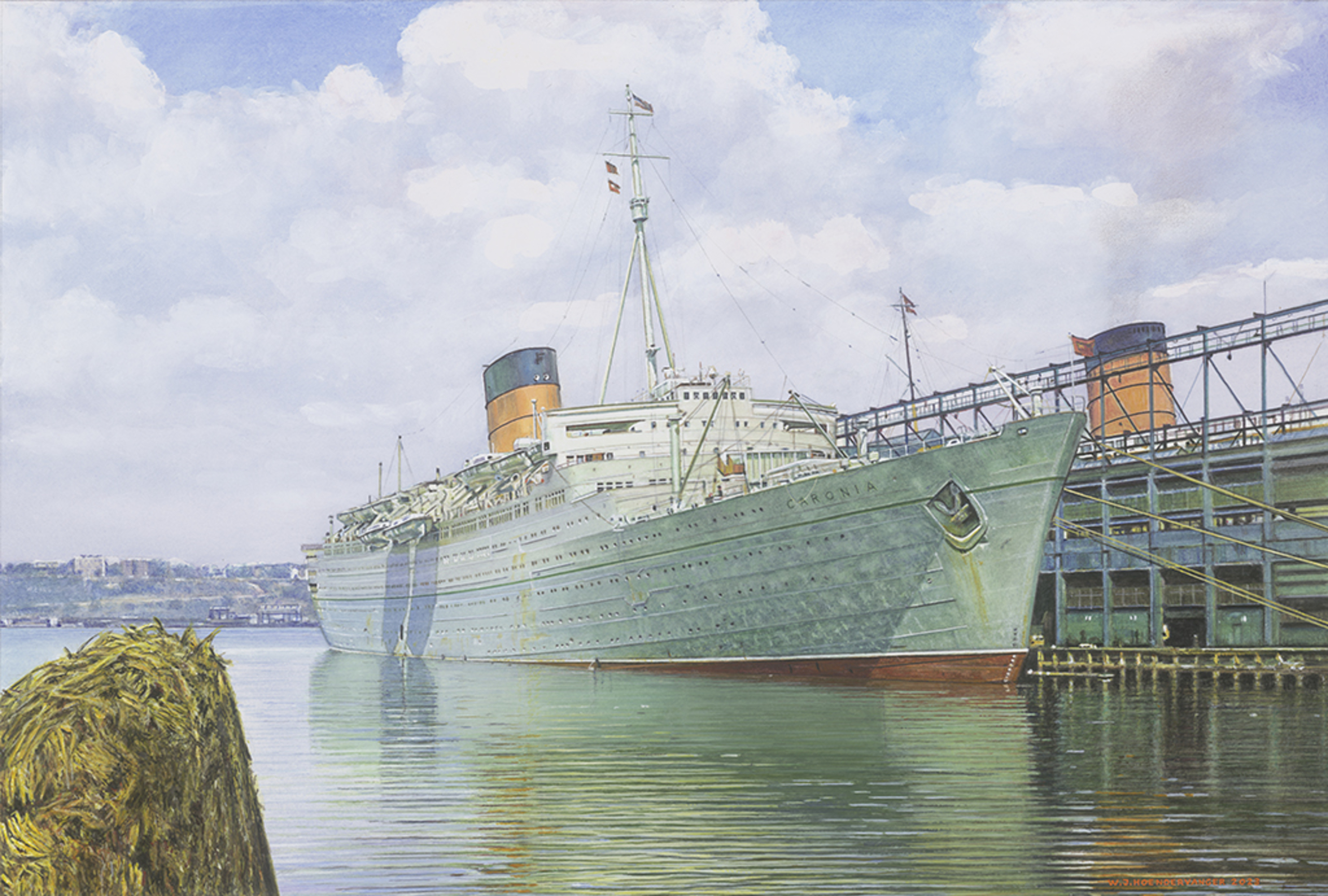 Deze aquarel toont Caronia bij de Cunard-pier in New York. Het stond al een tijdje op de to do lijst. Het was erg leuk om dit schilderij te maken, vooral de 4 tinten groen. Ik hoop haar in al haar waardigheid te hebben vastgelegd. © W.J.Hoendervanger