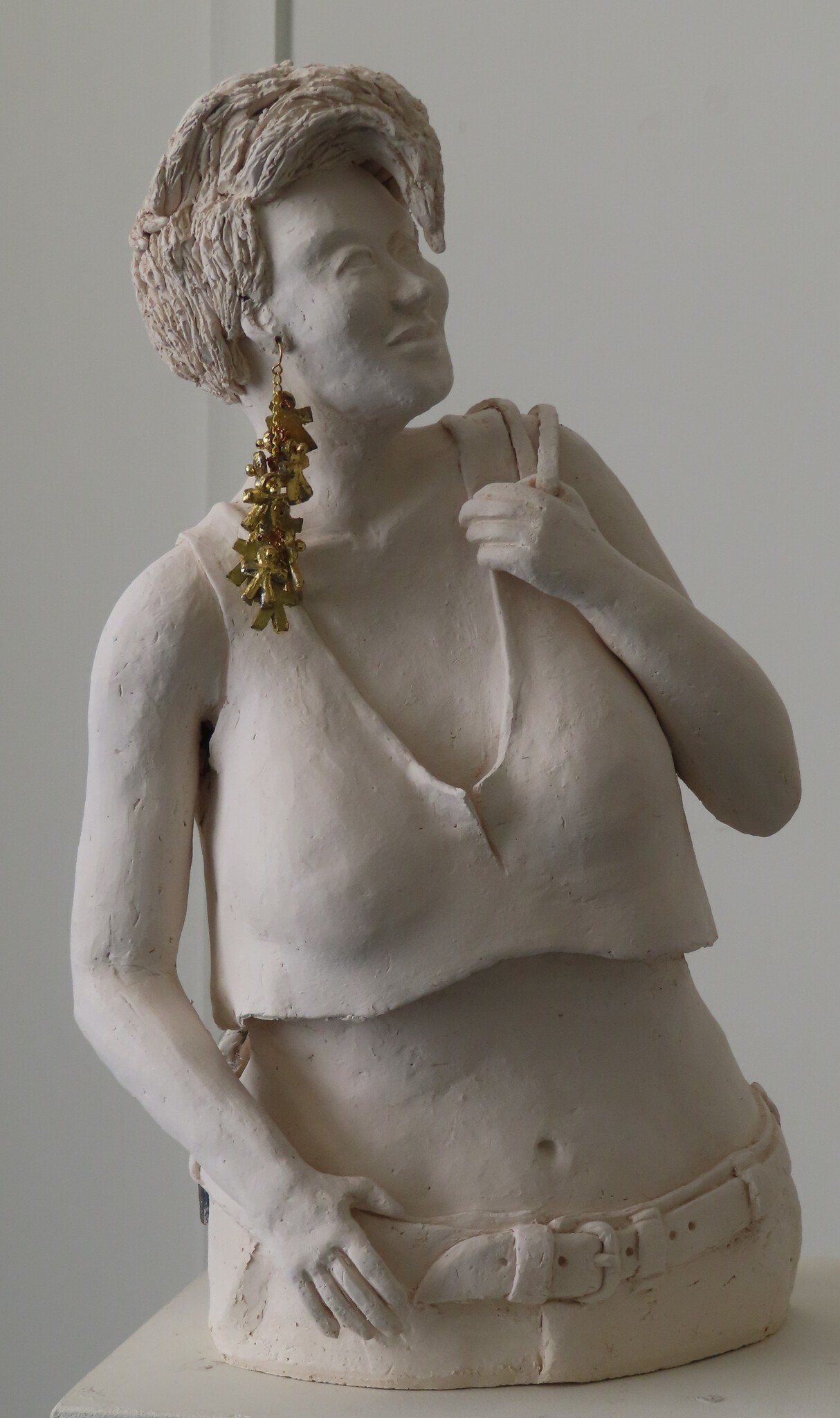 stoere weerbare vrouw. overwinningen hangen in de oorbel, zo nodig steekt een pistool in de broekriem.