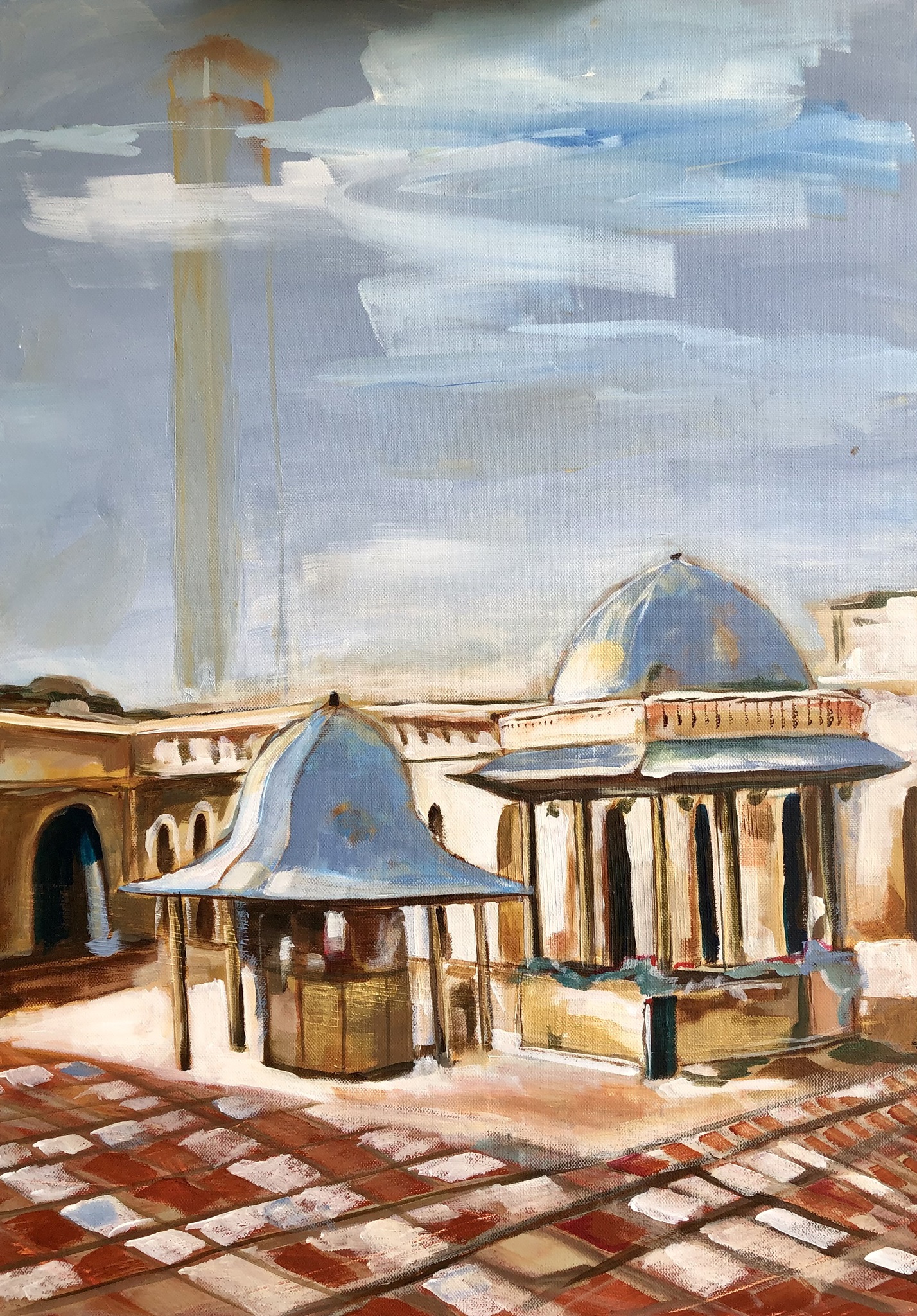 Het lezen van het boek 'de bijenhouder van Aleppo' inspireerde mij tot het maken van dit doek. Het geeft de 13e eeuwse moskee van Aleppo weer die door de burgeroorlog in een woestenij is veranderd. Achter de moskee zie je de 'fata morgana' van wat ooit de minaret was.