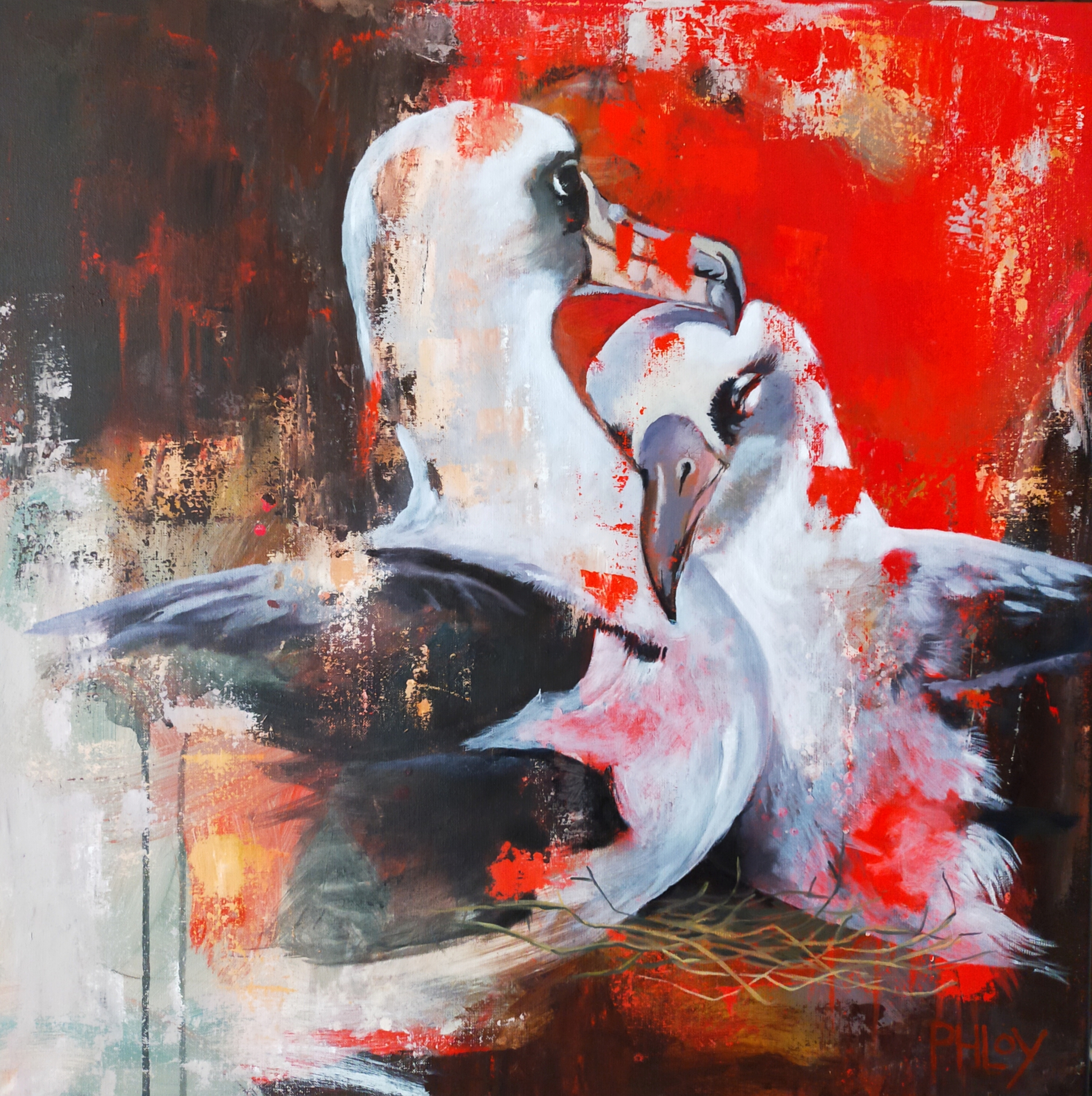 Deze twee verliefde albatrossen zijn geschilderd in een abstracte achtergrond van overwegend rode tinten.