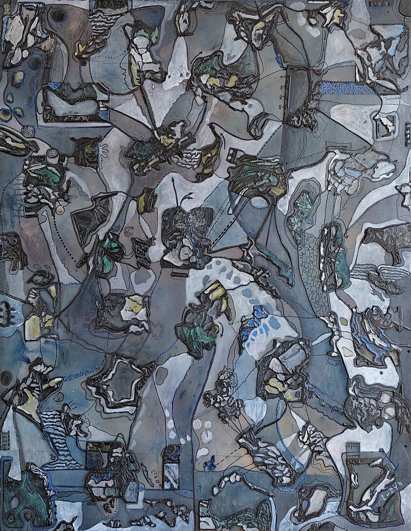 Iets in de buitenwereld intrigeert mij en door deze impressie uit te werken wordt zij blijvend deel van mijn binnenwereld. Laag na laag bouw ik aan de uiteindelijke vorm. Tijdens het werken komt er een stroom van associaties op gang. Het is een constant zoeken naar evenwicht tussen de verf en de andere materialen.