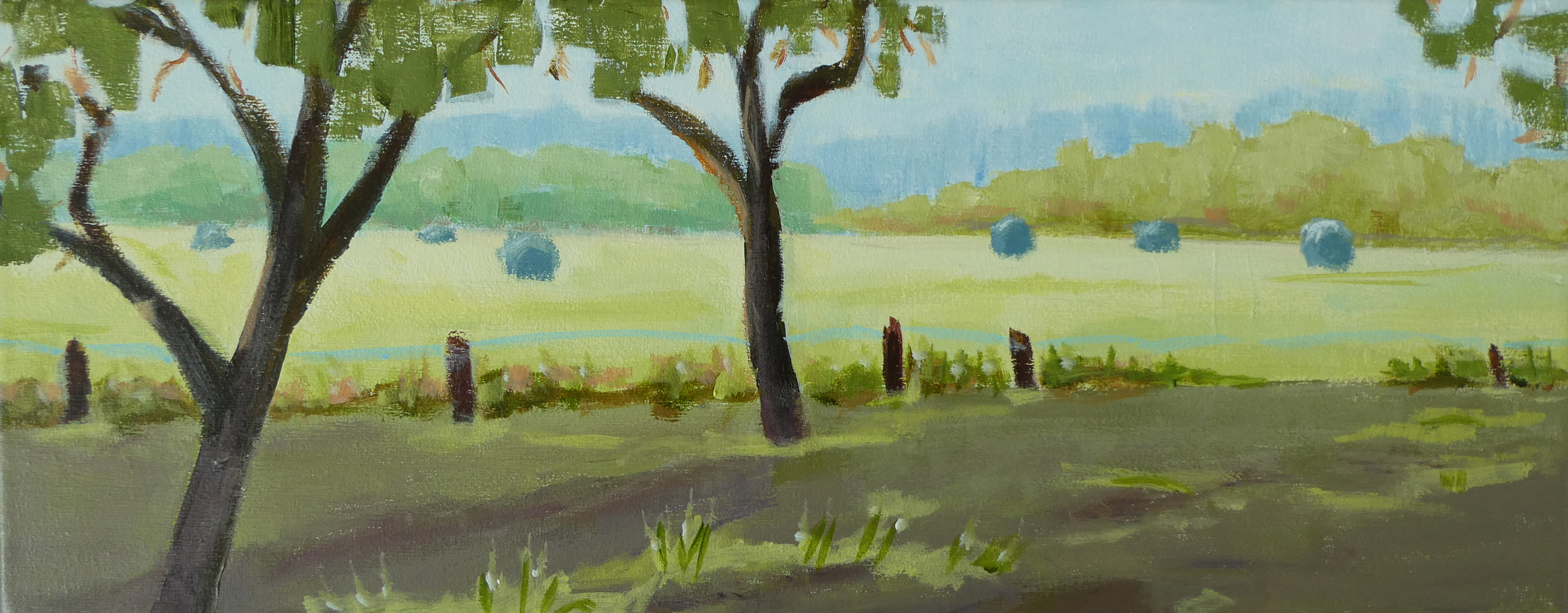 's Ochtends vroeg, het is nog heel stil. Dit schilderij is plein air gemaakt in acryl op canvas. Geschilderd in de vroege ochtend in het land van de buren. Dit schilderij wordt geleverd in een witte houten lijst.