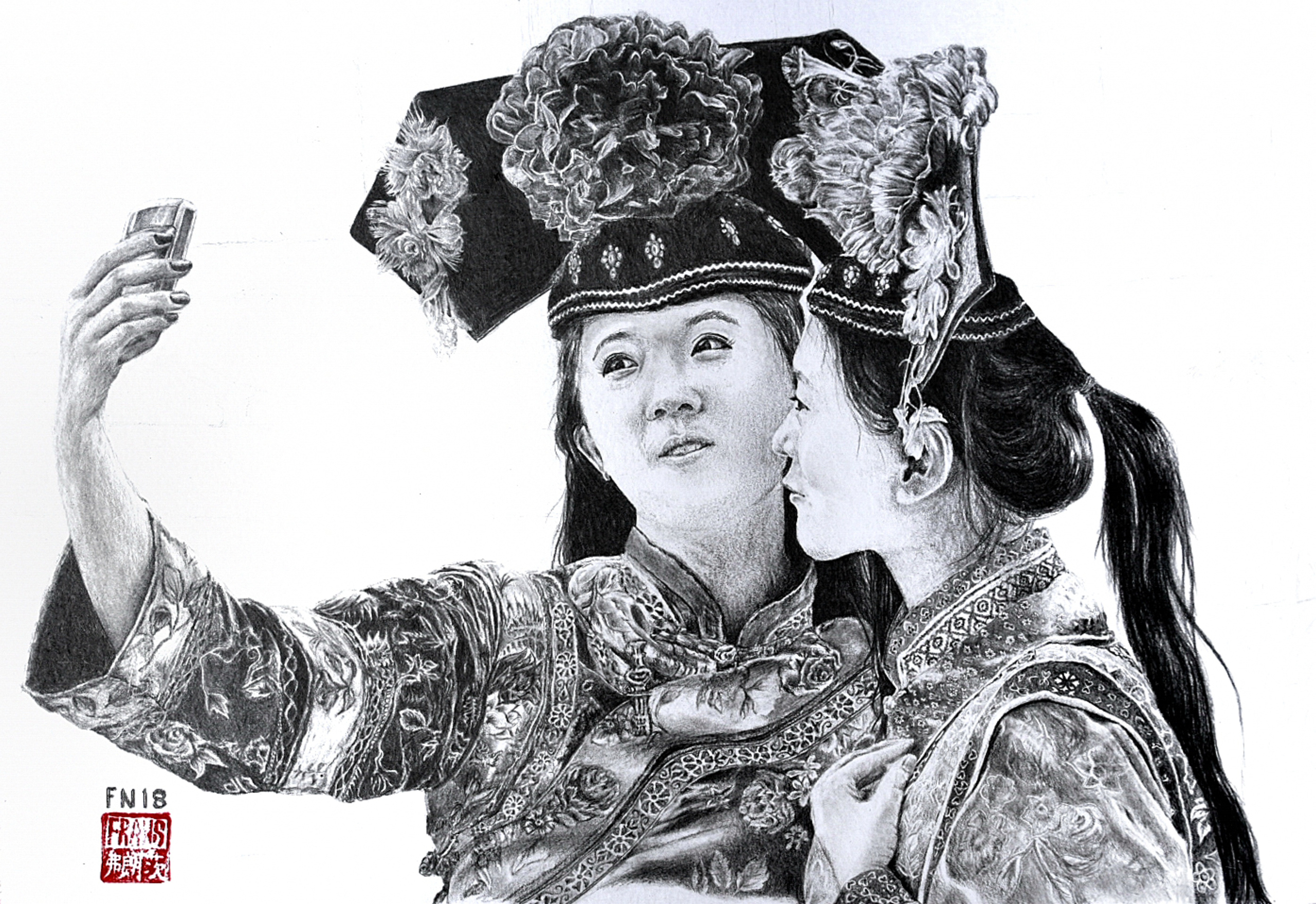 Met schilderen gaat het net als met fotografie, wat mij betreft, vooral om het verhaal. Tijdens ons verblijf in China had ik een grote serie mooie foto's gemaakt. In de verboden stad in Beijing stonden een paar traditioneel geklede mooie meisjes in super fraaie kleding. In hun handen hadden zij een mobieltje. Dit vormde een erg leuk contrast. De tekeningen op de gewaden zijn een weelde om te maken.