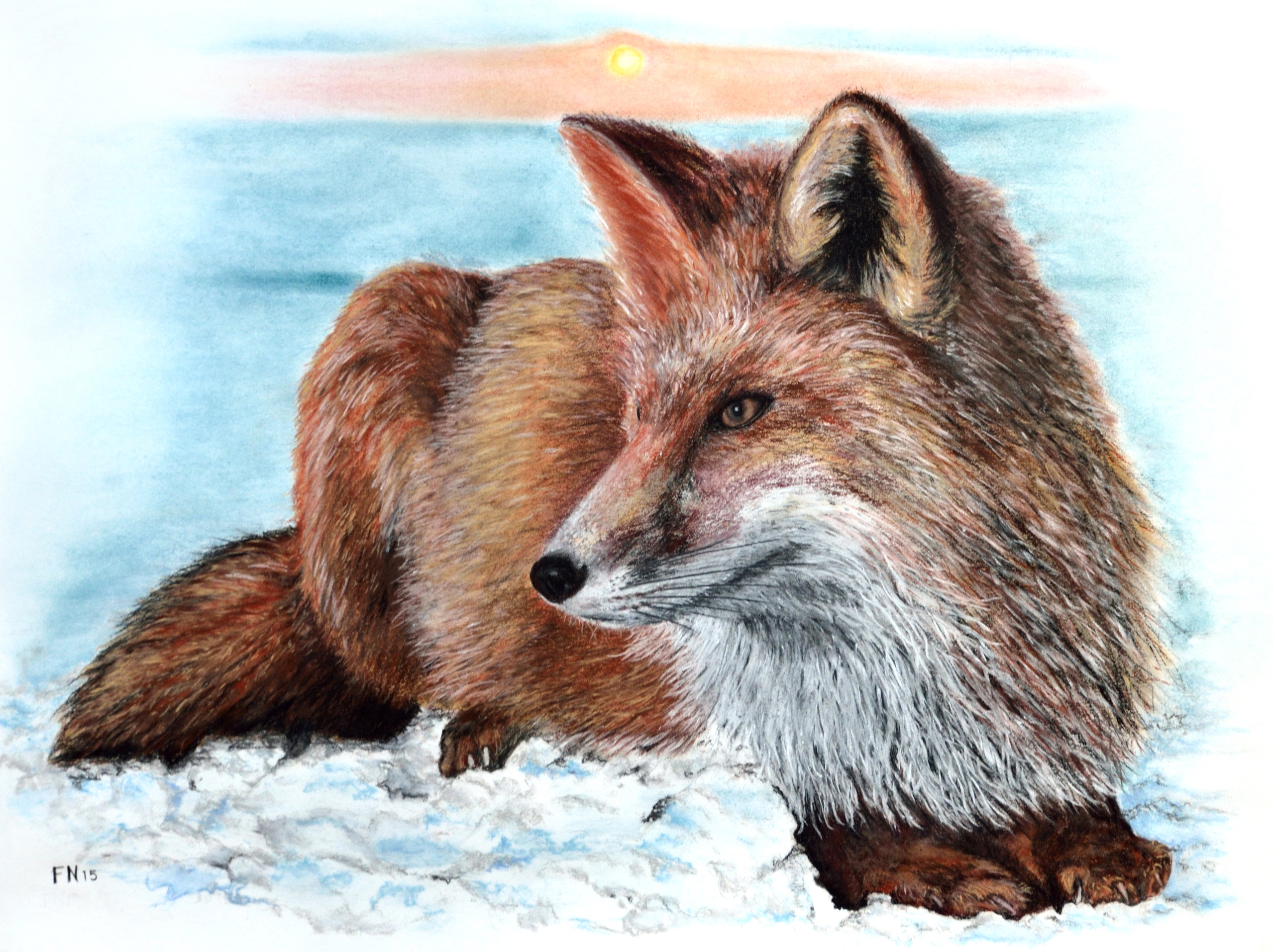 Dit conté schilderij stelt een vos voor in een sneeuwachtige omgeving. Ik heb het voor een goede vriend René Haagendoorn gemaakt. Hij is een jager met een haat - liefde verhouding met vossen. Hij vindt het prachtigen dieren, maar ze vreten te veel vogels en konijnen.