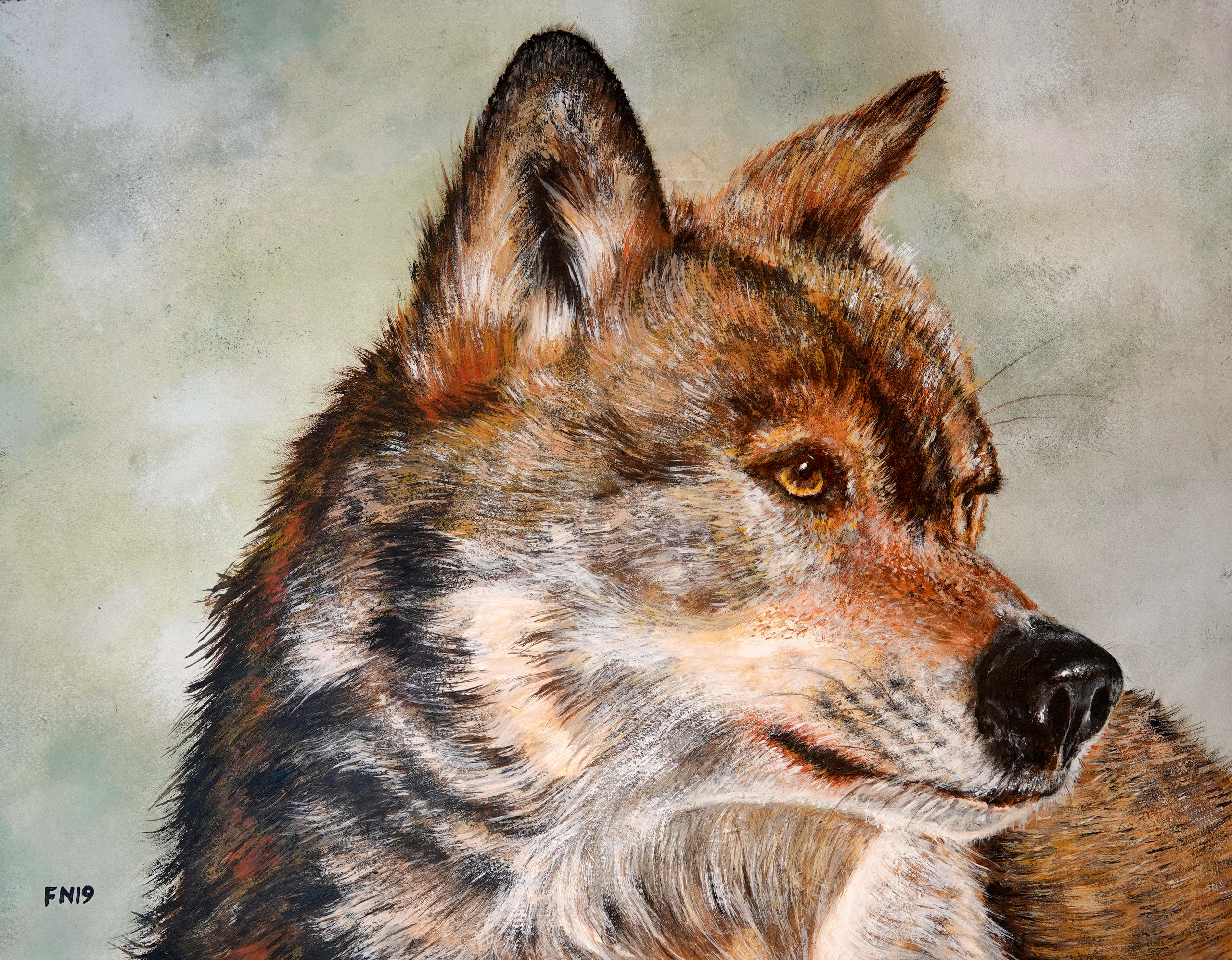 In het Beierse woud heb ik o.a. wolven in de sneeuw gefotografeerd. Van deze mooie dieren heb ik een portret van zijn kop gemaakt. In het acryl schilderij zijn de haren met een zelfgemaakte kwast met slechts enkele haren gemaakt.