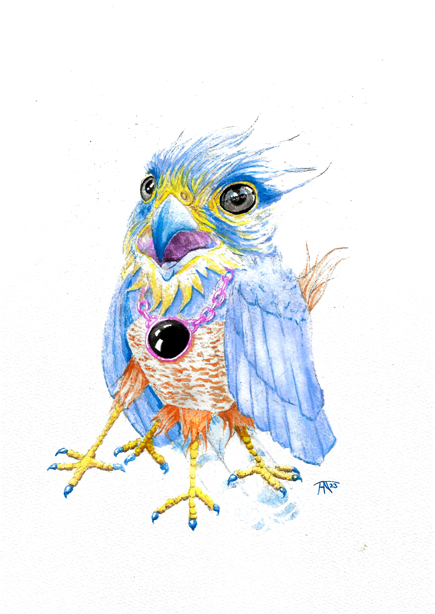 Heerlijk, alles aan de aquarel van deze stoere sperwer klopt niet. Hij heeft vier poten en een veel te klein lijf.