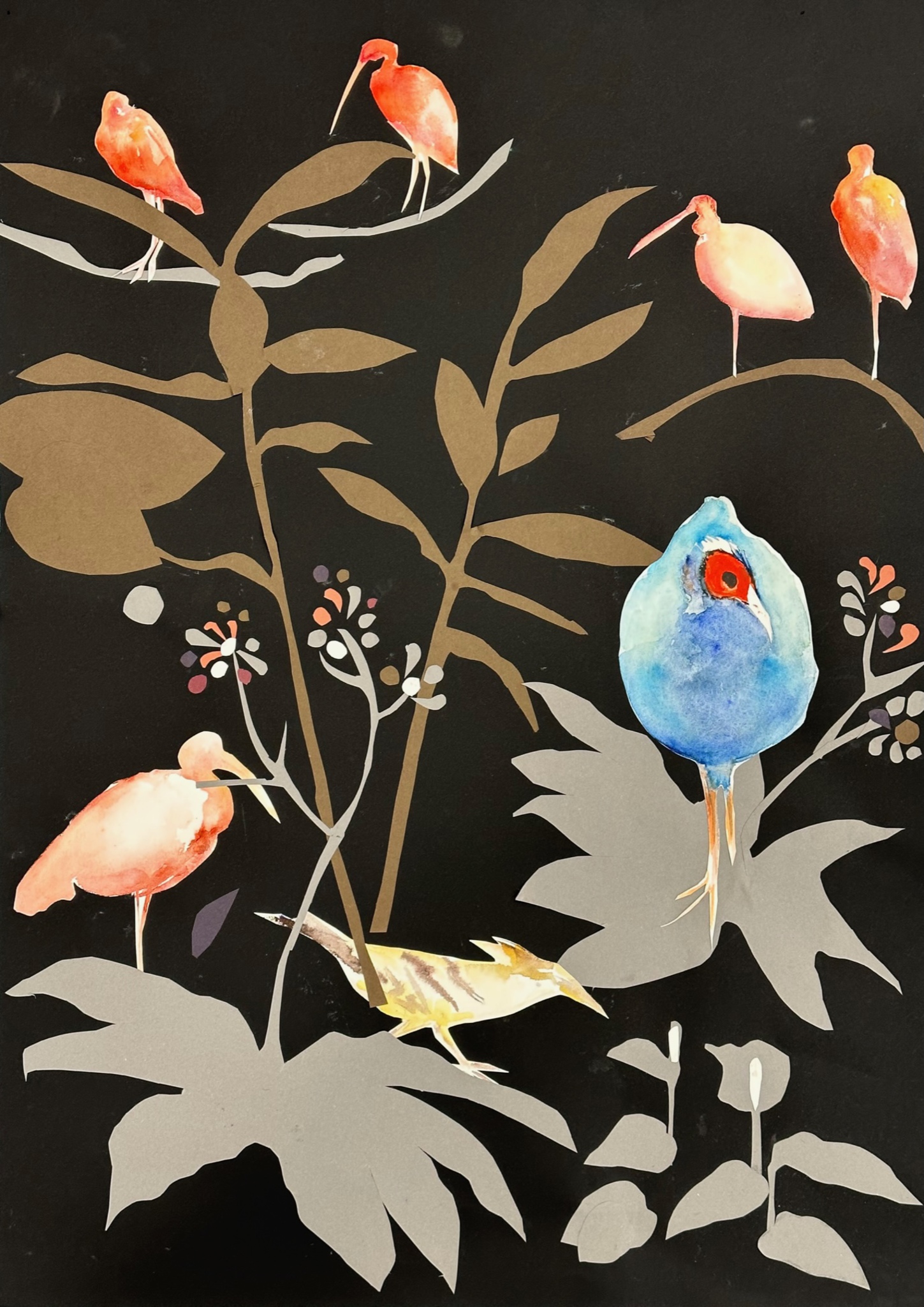 Zo maar wat Artis-vogels bij elkaar. De vogels in aquarel, collage van papier
