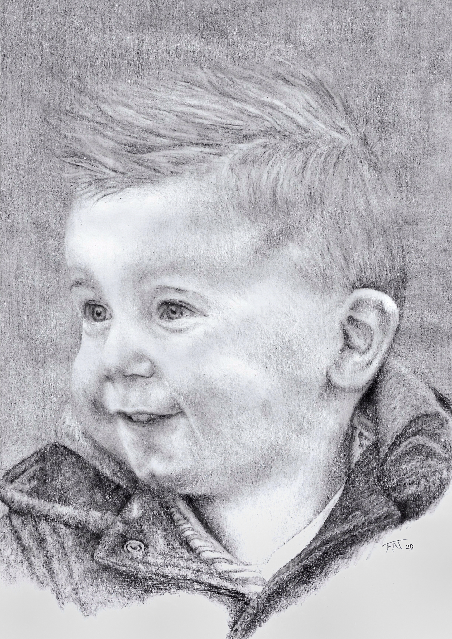 Van mijn kleinzoon Daan wordt ik altijd vrolijk. Hij kijkt op dit portret ook guitig opzij. Het is een tekening in potlood.