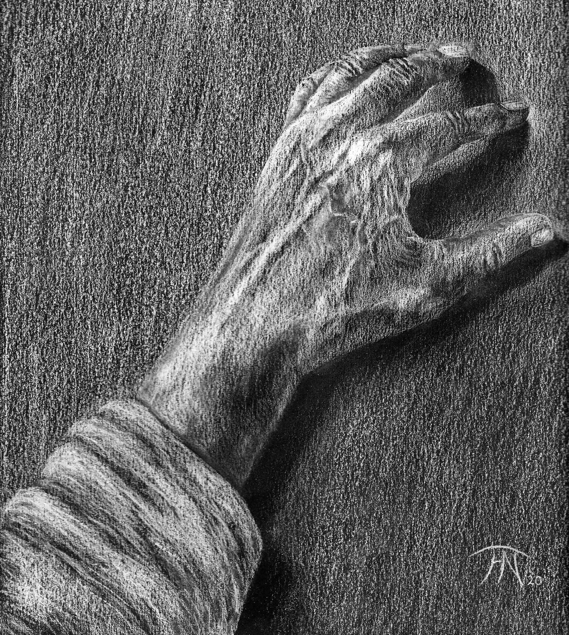 Pastel van mijn hand op zwart papier.