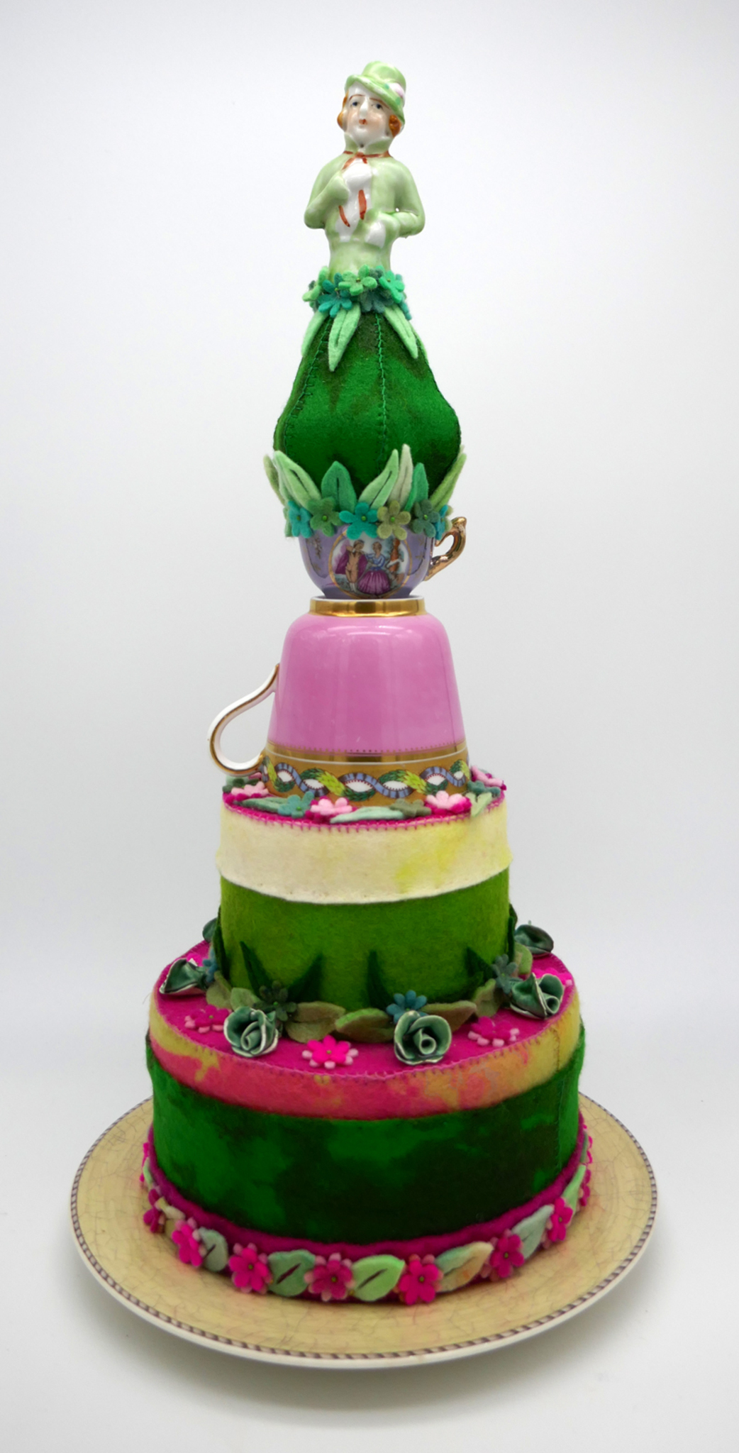 deels handgeverfd wol vilt, keramiek, antiek poppenhoofdje, borduurzijde, foam, spelden.