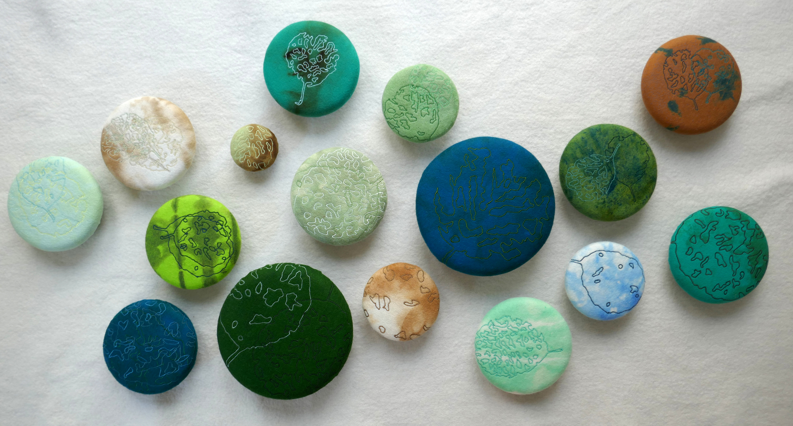 deels handgeverfd wol vilt, glansgaren, vnaaigaren, houten knoppen. (2022 en 2023). Borduurpatronen van vraatschade aan de Zwarte Els, Alnus glutinosa, door het Elzenhaantje, Agelastica alni. 4 maten; 19-19-6 cm (2x) 13,5-13,5-4 cm (10x) 11,5-11,5,4 cm (3x) 7-7-x3 cm (1x)