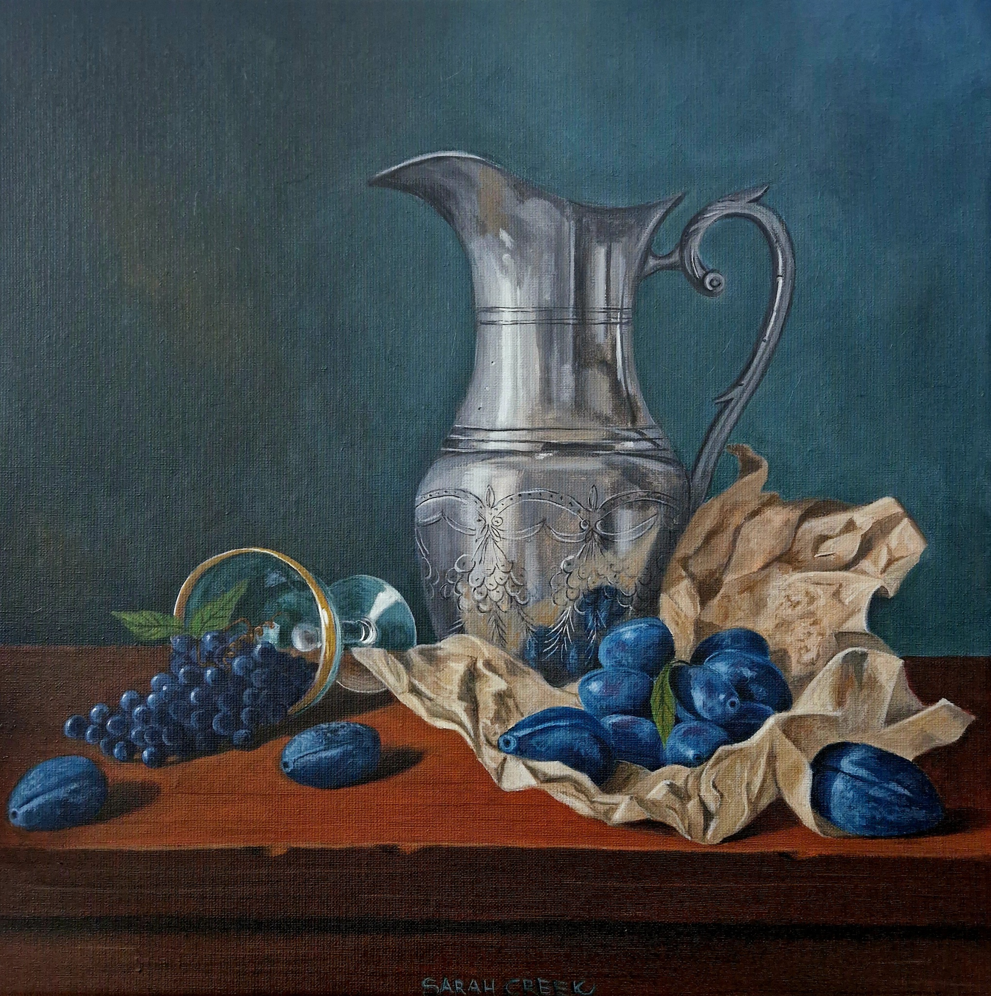 Sarah Creek schildert met acryl op canvas of linnen. Onderwerpen zijn portretten en stillevens. Sarah geeft les aan 55 talentvolle cursisten in een atelier aan huis.