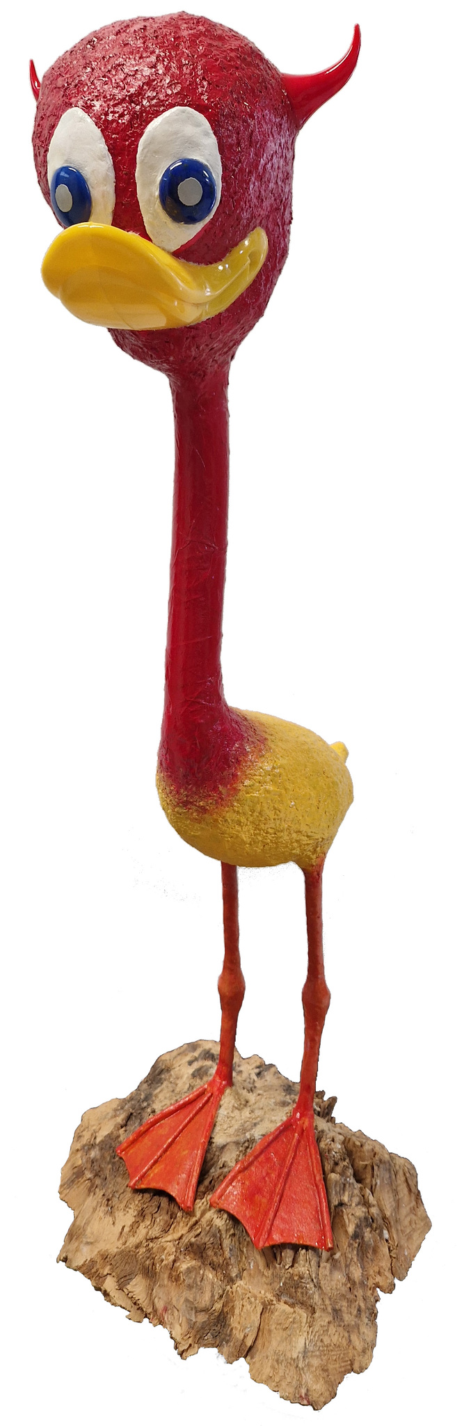 vogel vervaardigd van papier-maché eend met duivelshoorntjes