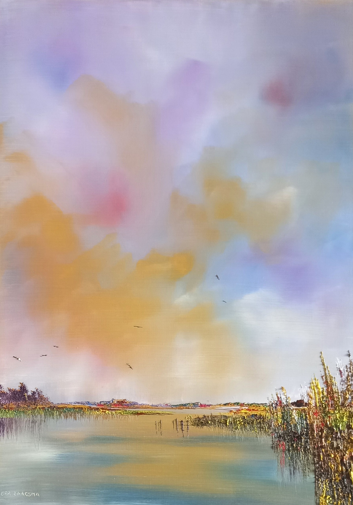 Realistische aquarellen en olieverf schilderijen van Hollands landschap, met altijd expressieve luchten boven de lage horizon zich spiegelend in de waterrijke polder. Ook werken uit de Franse Morvan en van de Oostelijke Algarve in Portugal.