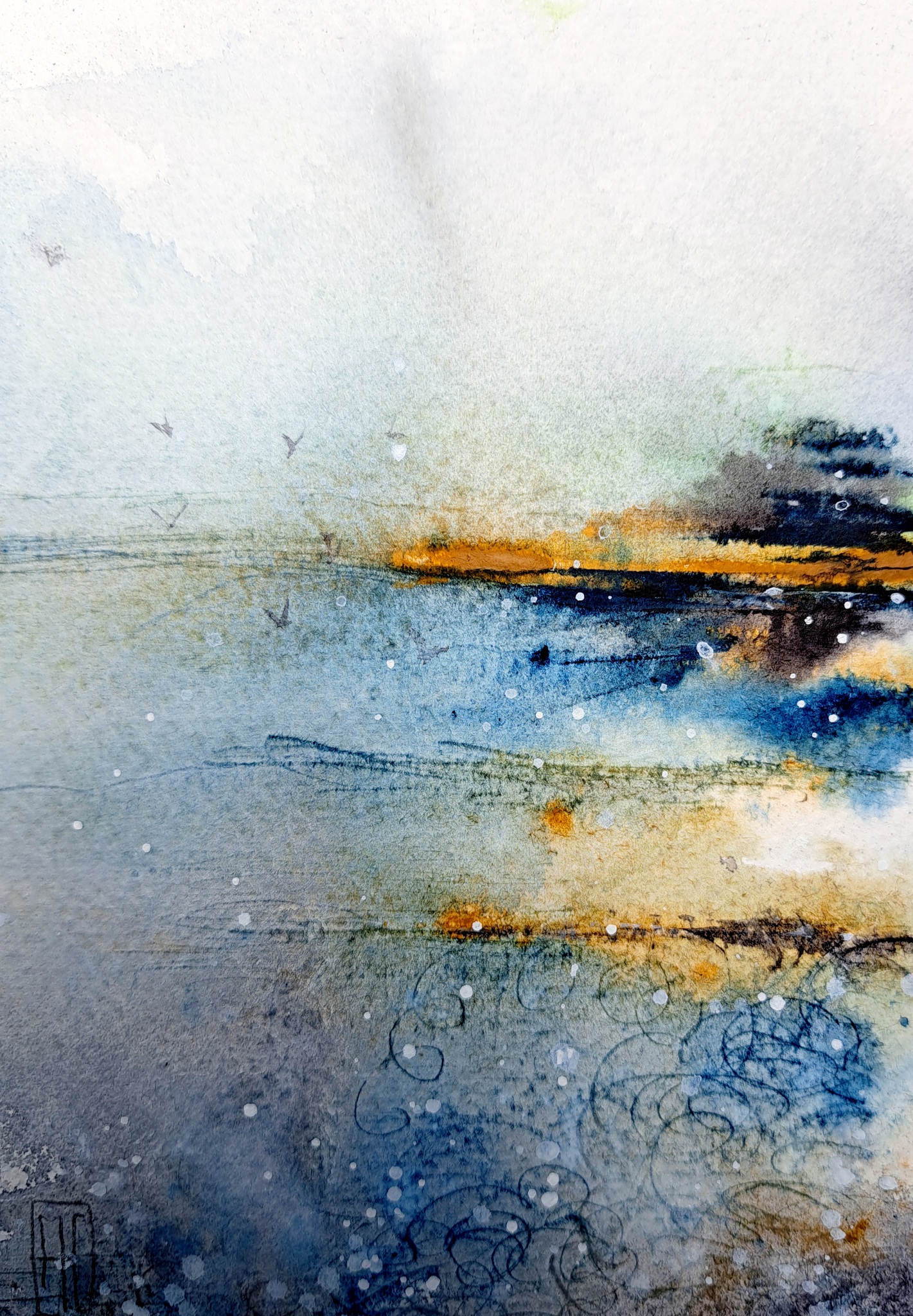 Een sfeervol landschap in gemengde techniek in een passepartout.