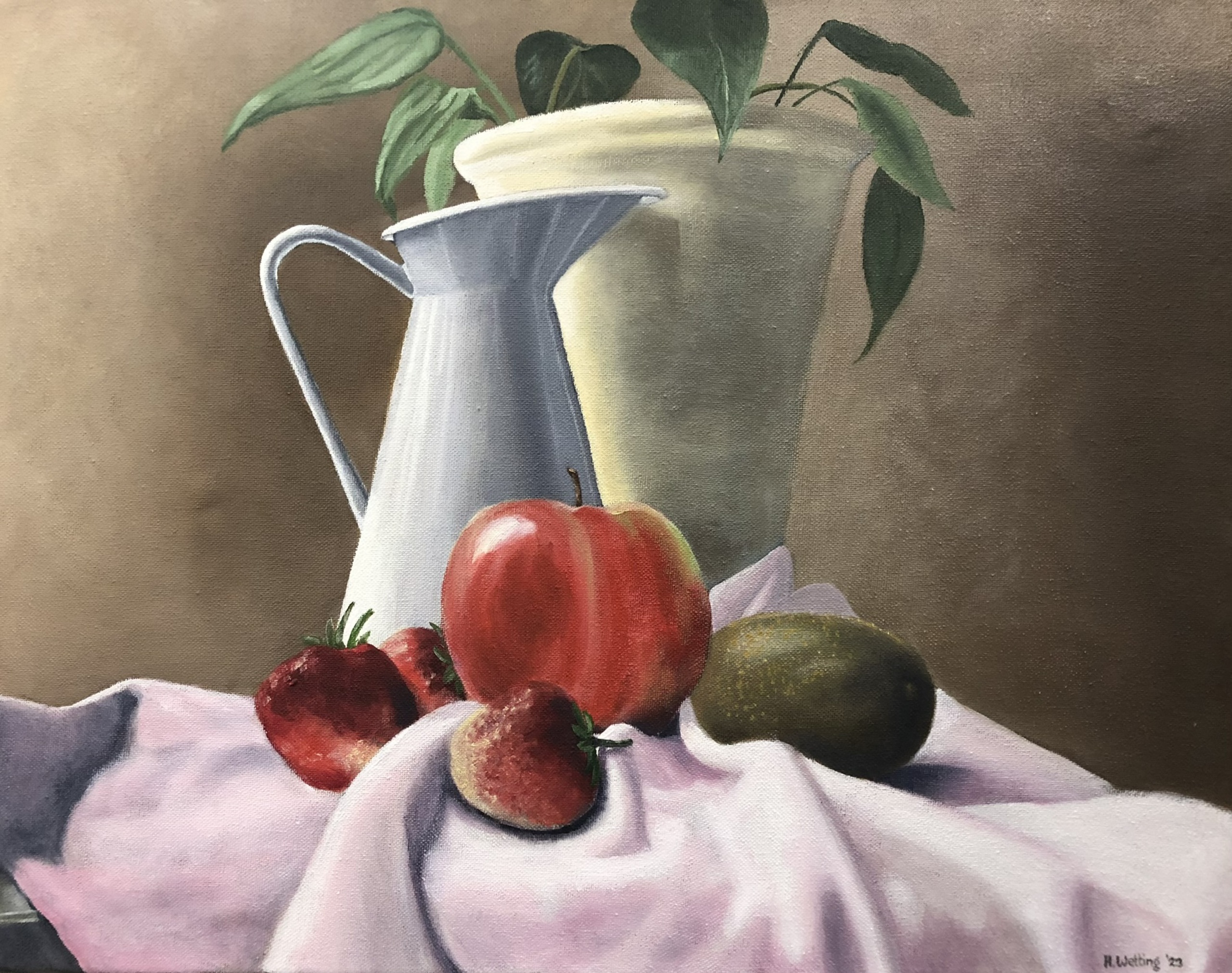 Een stilleven met appel, aardbeien, kiwi, kan en potplant.