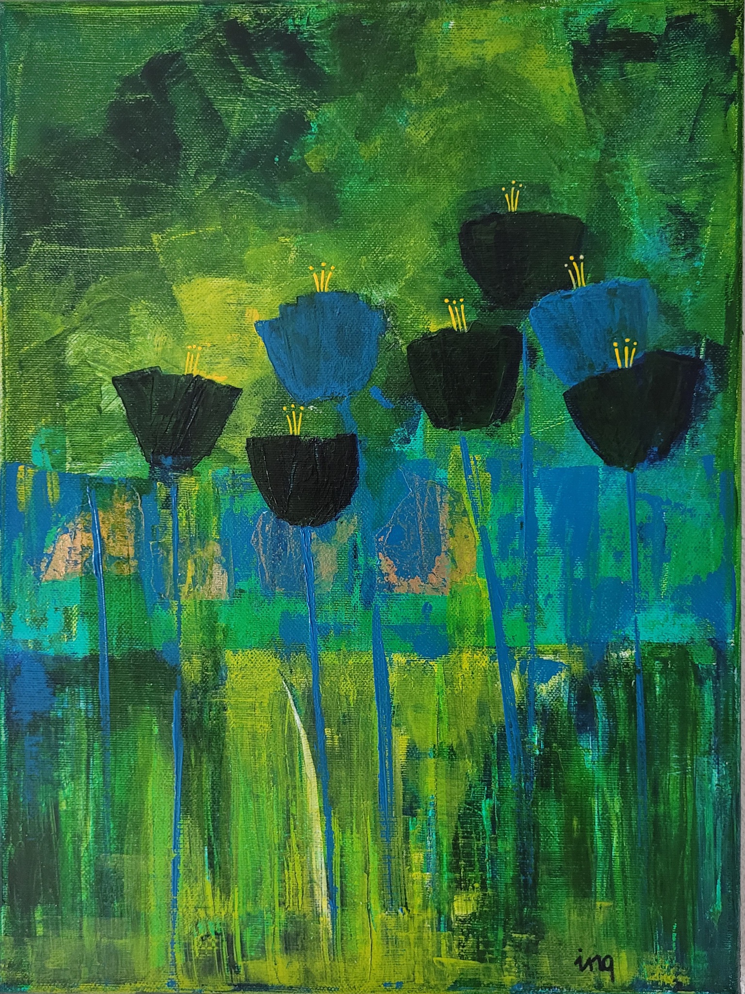 Blauwe en groene kleuren vind ik een spannende combinatie. Met paletmes de bloemen gemaakt. Ik vind het ook leuk om mezelf zo te verrassen.