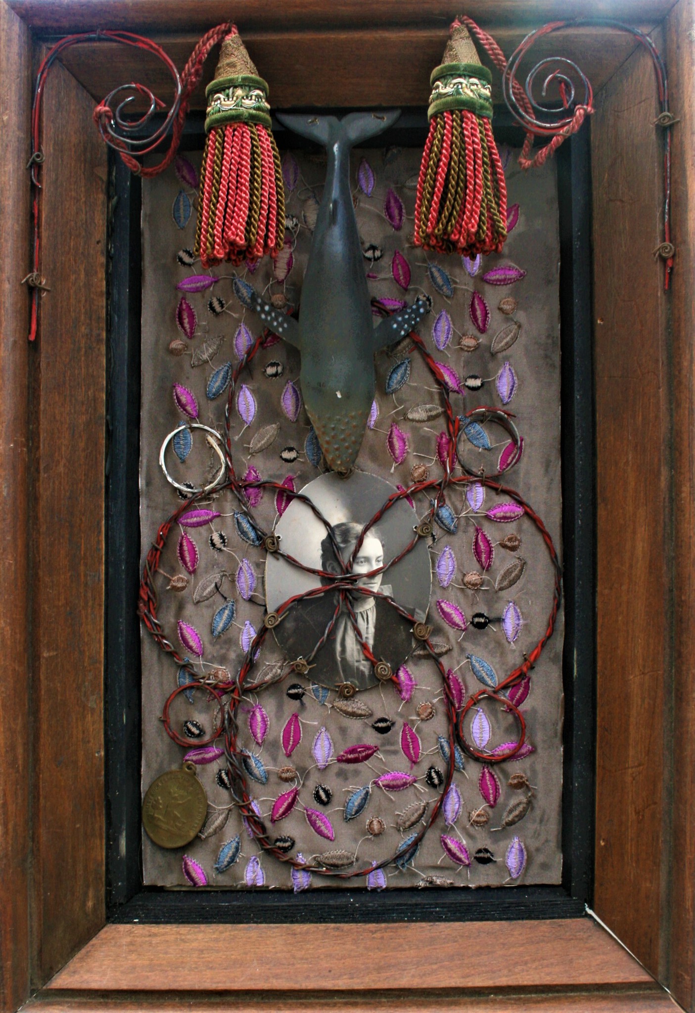 Antieke foto in originele lijst, bewerkt, ijzerdraad, acryl, collage, en uitdrukkelijk geïnspireerd (deze en de volgende) door wat men "kloosterarbeid/klosterarbeid" noemt