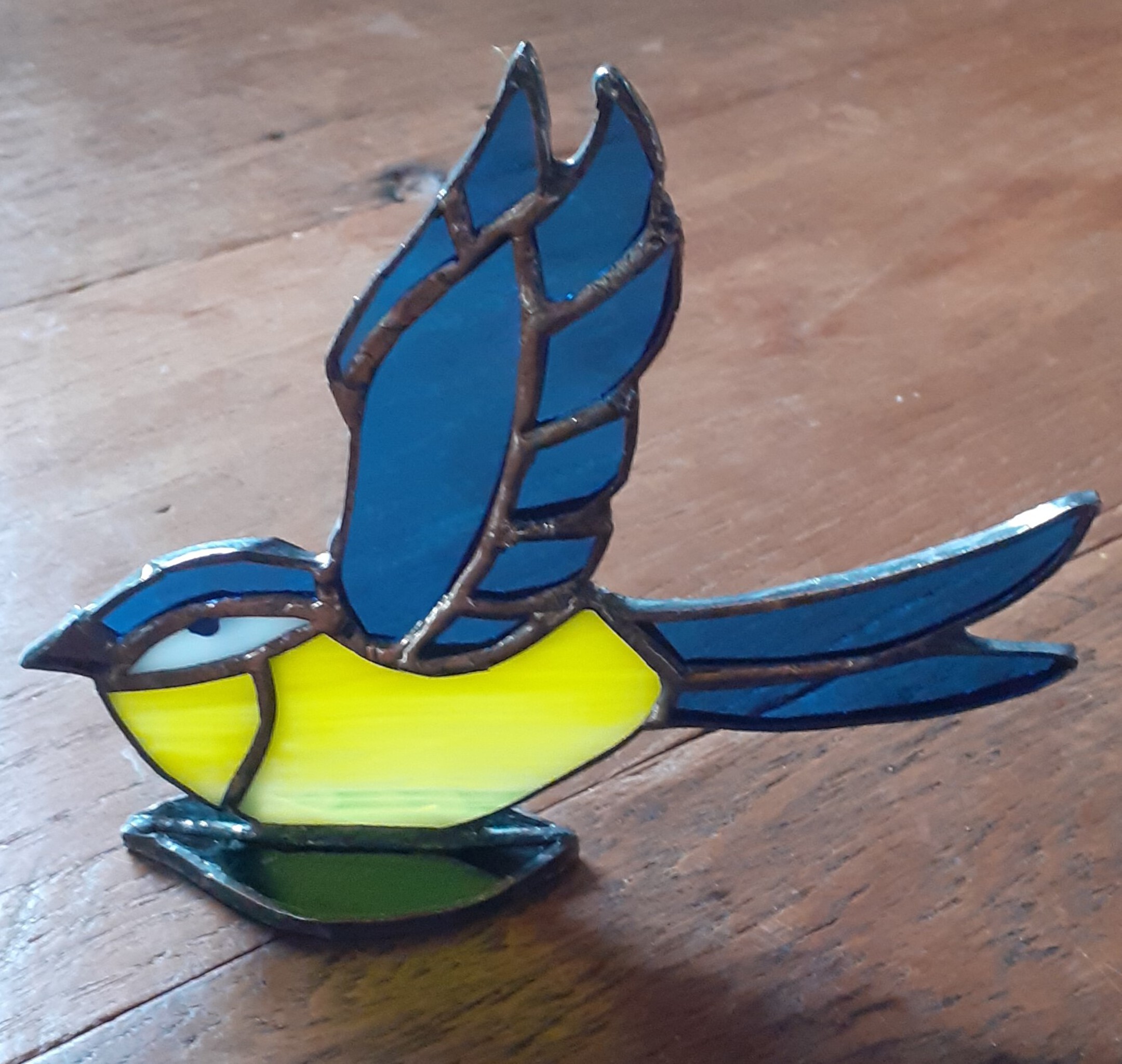 Tommy tit is gemaakt volgens de Tiffany-methode. Hij zit op een glazen blad om het stuk af te maken. Tommy zit heerlijk in de zon of op een vlakke ondergrond.