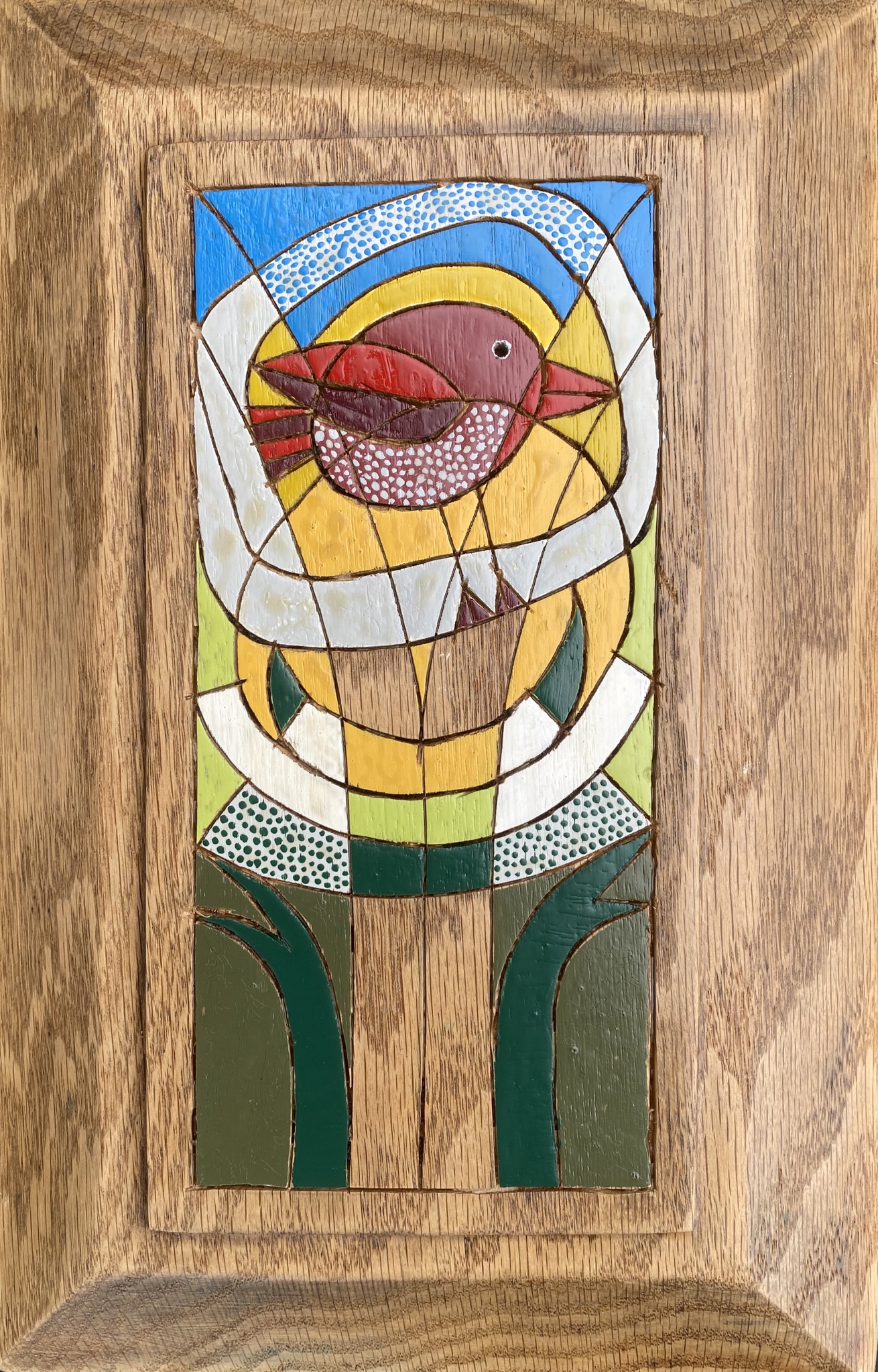 Houten kastpaneeltje. Lijnen met multitool zaagje. Kleuren toegevoegd met penseel.