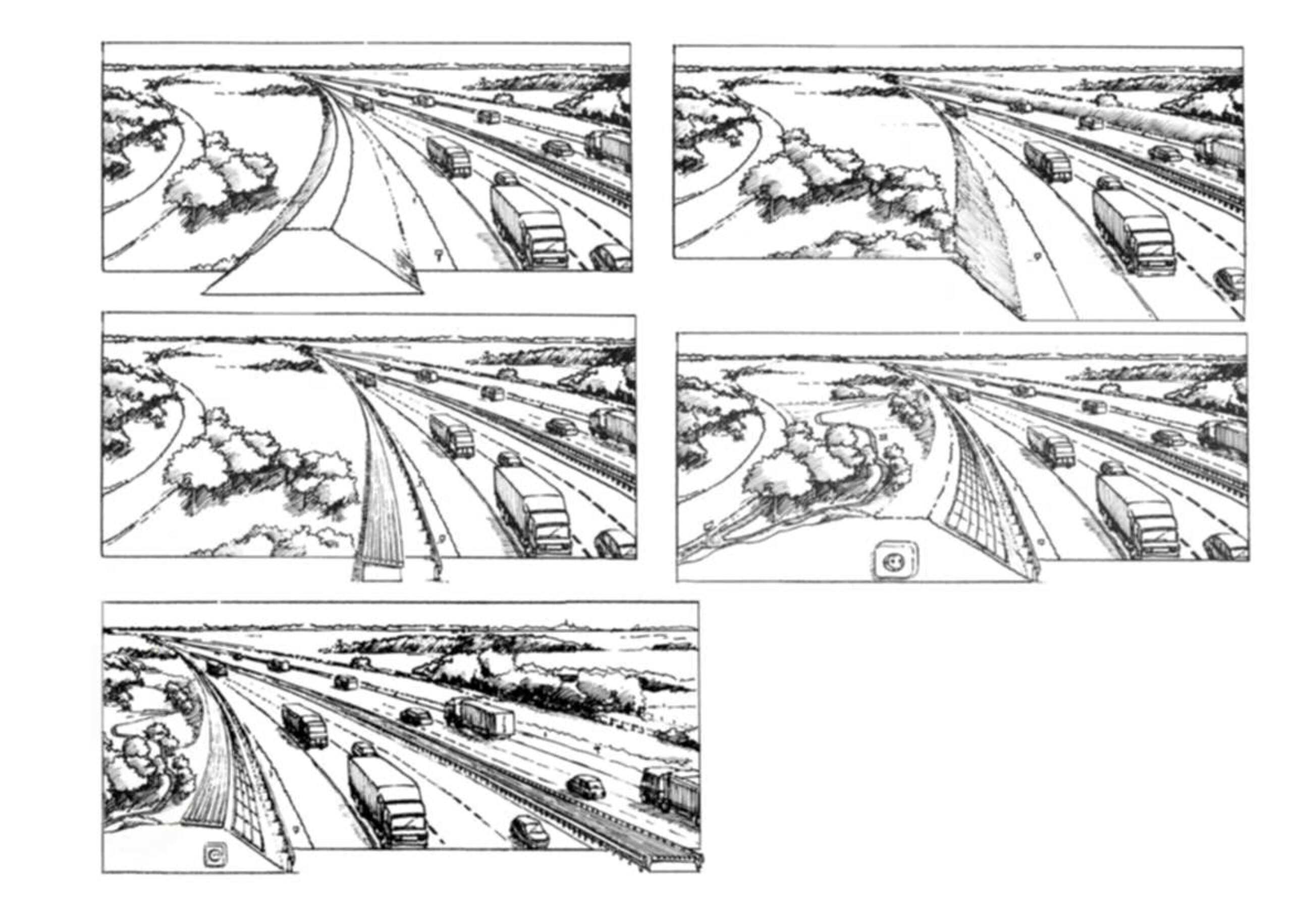 Aantal schetsen van mogelijke geluidsmaatregelen bij Bathmen, onderdeel van plan.