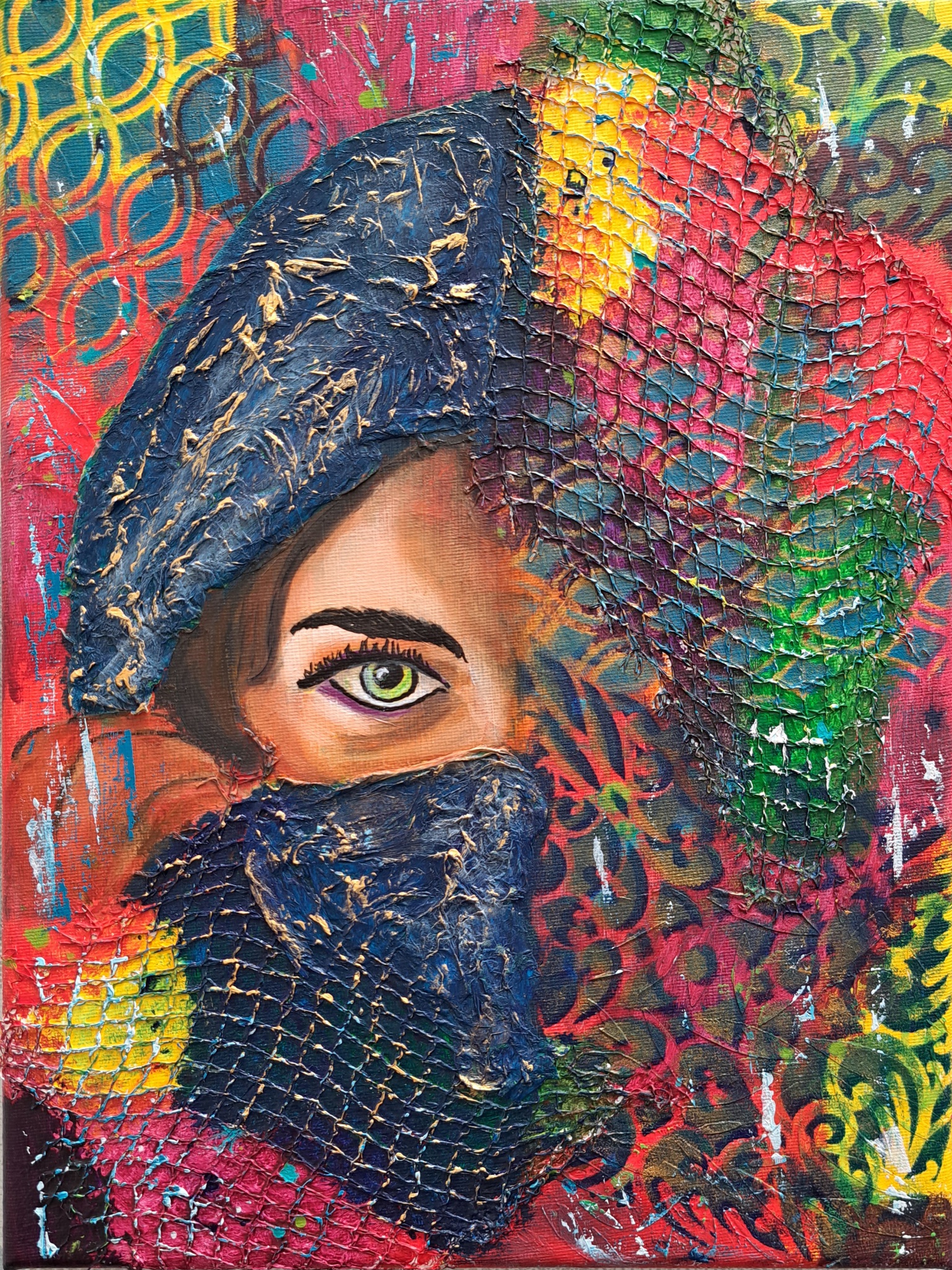 Opgebouwd in lagen en met verschillende materialen met structuur. Portret daarin geïntegreerd. Mixed media op linnen doek.