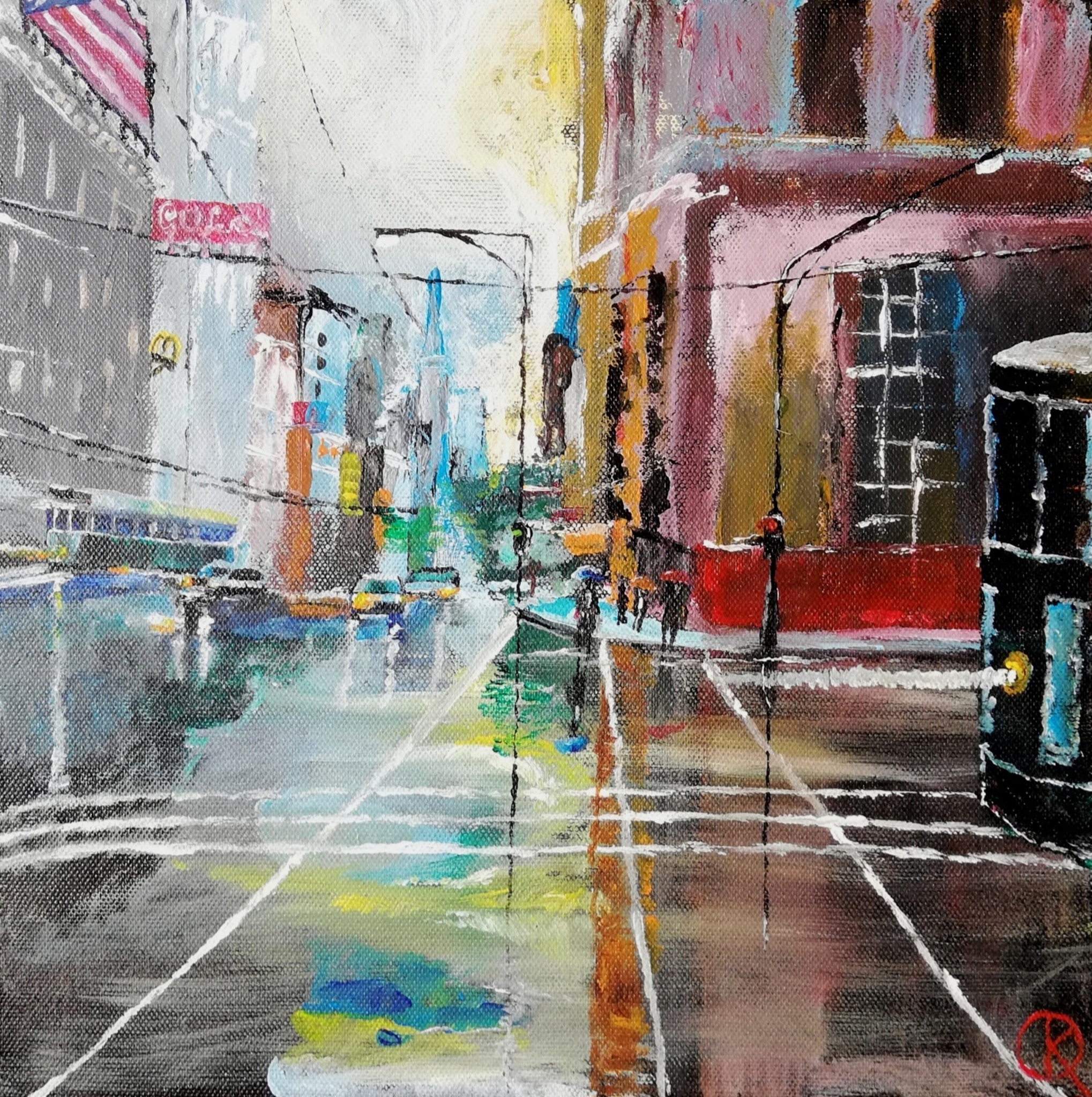 "Chicago" is een schilderij waarbij ik de magische zonsondergang heb vastgelegd tussen de regenachtige straten van Chicago.