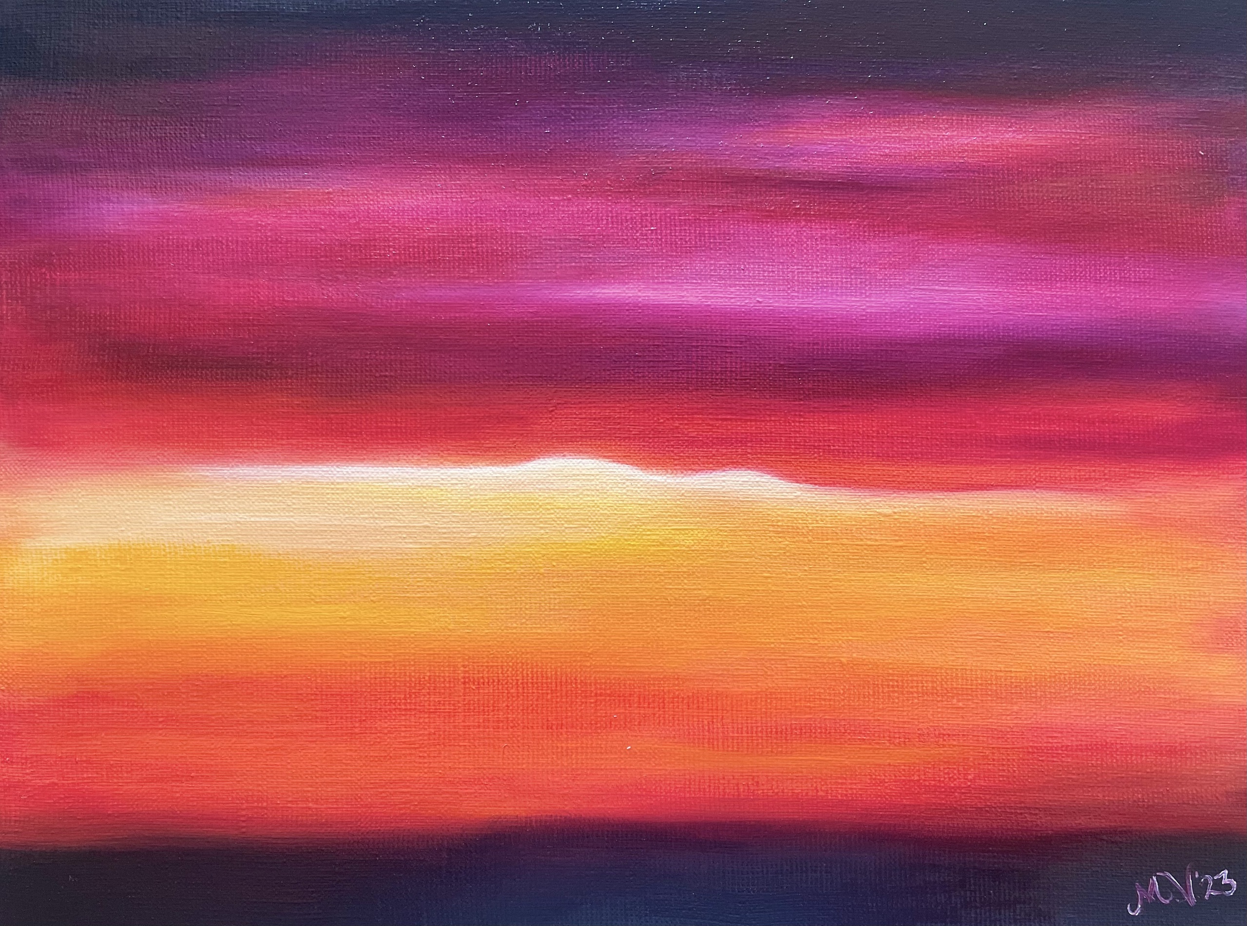 Geschilderd op linnen en geïnspireerd op de mooie zonsondergangen en kleuren in de lucht boven de Scheveningse stranden en zee. En voornamelijk de olieverf kleur gebruikt van Old Holland genaamd “Schevenings Rood”.