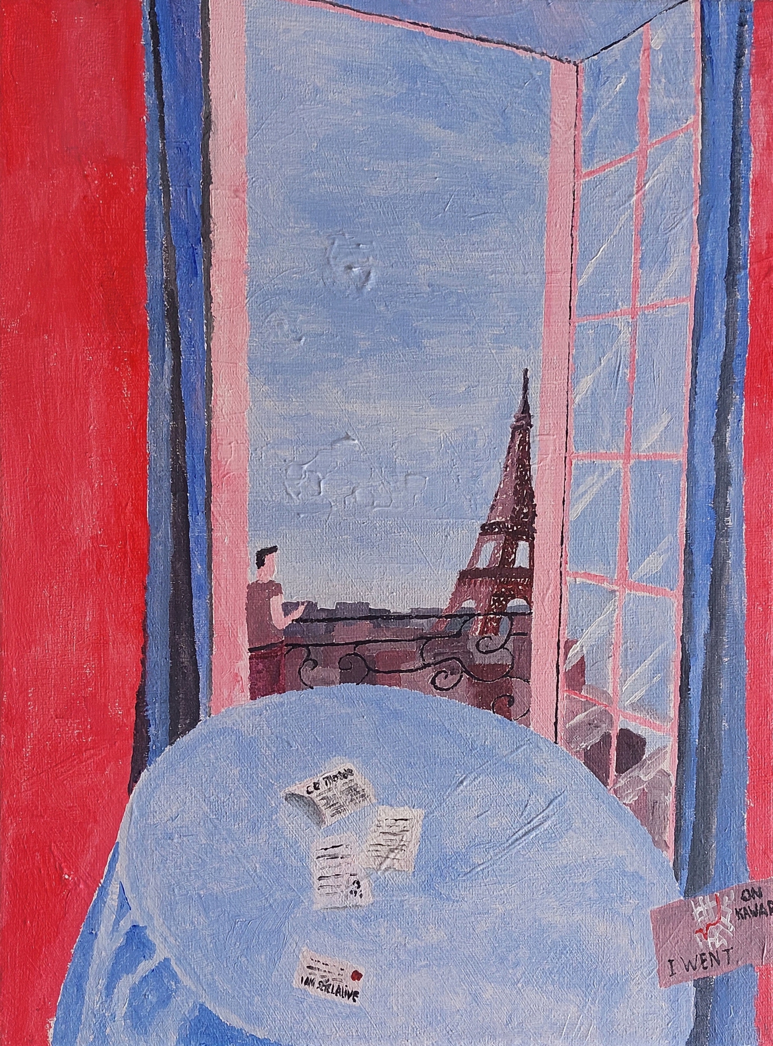 Dit is het tweede schilderij uit mijn serie van drie schilderijen over de levensloop van de Japanse kunstenaar On Kawara. Alle drie de schilderijen zijn alleen gemaakt met de kleuren rood, blauw, zwart en wit, want dit waren ook de enige kleuren die On Kawara in zijn werk gebruikte. On Kawara was in zijn leven veel op reis en tijdens deze reizen stuurde hij telegrammen naar zijn vrienden en familie. Deze telegrammen waren erg merkwaardig en daarom zijn deze tegenwoordig te zien in meerdere musea in de wereld. Zo stuurde hij een paar keer een telegram met de tekst "I Went". Er was dan bij dit telegram een kaart gevoegd waarop On Kawara met een rode lijn exact had aangegeven hoe hij die dag was gelopen. Ook in dit schilderij zijn een paar van deze telegrammen afgebeeld. Verder is te zien dat On Kawara (op het balkon) zich bevindt in Parijs, de stad waar hij graag naartoe ging.