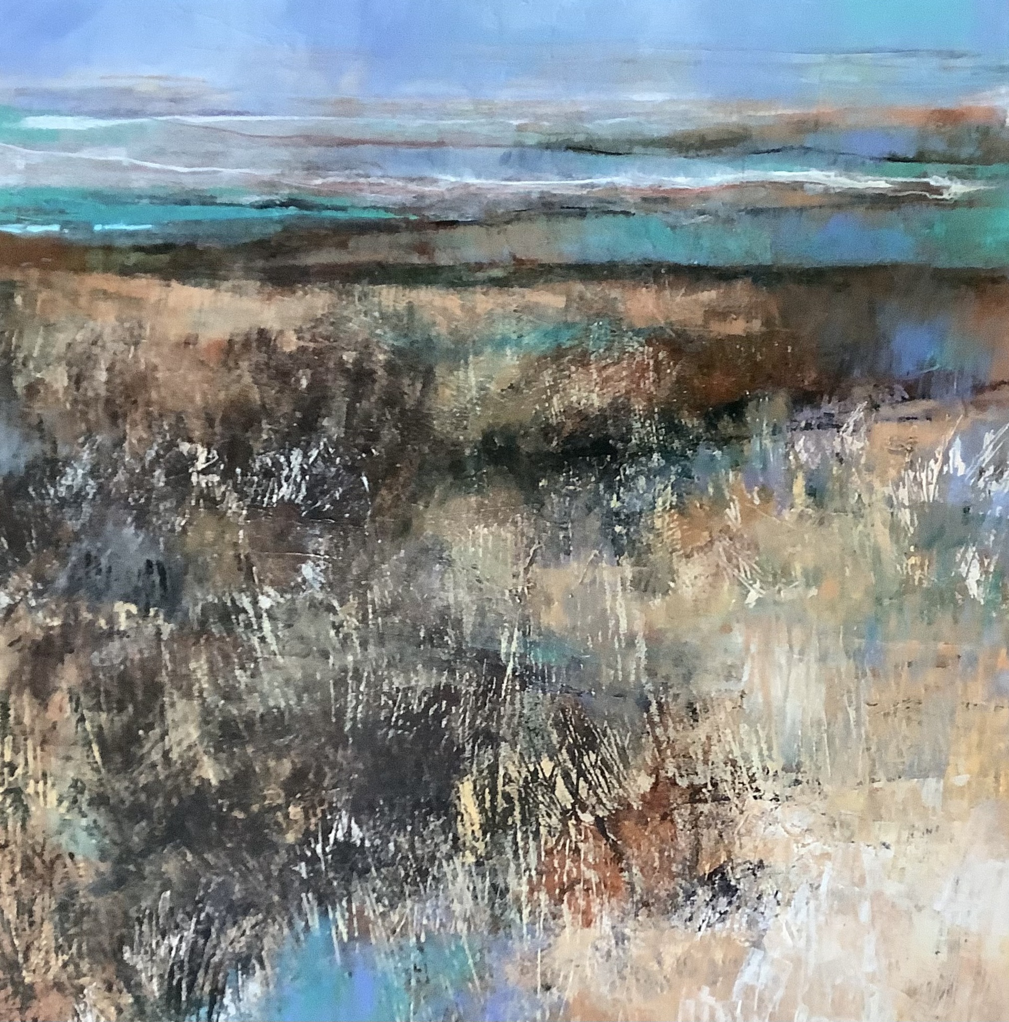 Een vierkant landschap van gras ,niet groen ,want dat is alleen in het vroege voorjaar, daarna krijgt het alle kleuren ,roze ,geel en vooral heel licht beige. Dit schilderij heeft een witte baklijst.