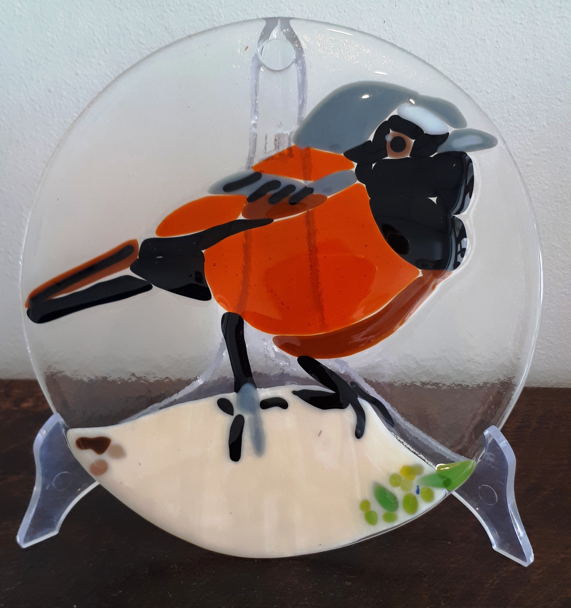 Op glasschaal van 20 cm rond de gekraagde roodstaart in Bullseyeglass. In opdracht.