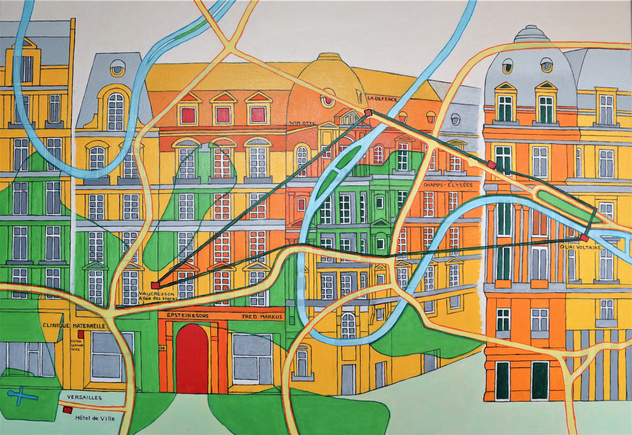 Op de Champs-Elysees was het architecten- en ingenieursbureau Epstein and Sons gevestigd waar ik vier jaar gewerkt heb. Het beeld is gemengd met de plattegrond van Parijs t/m Versailles, waar ik woonde en waar mijn kinderen geboren zijn.