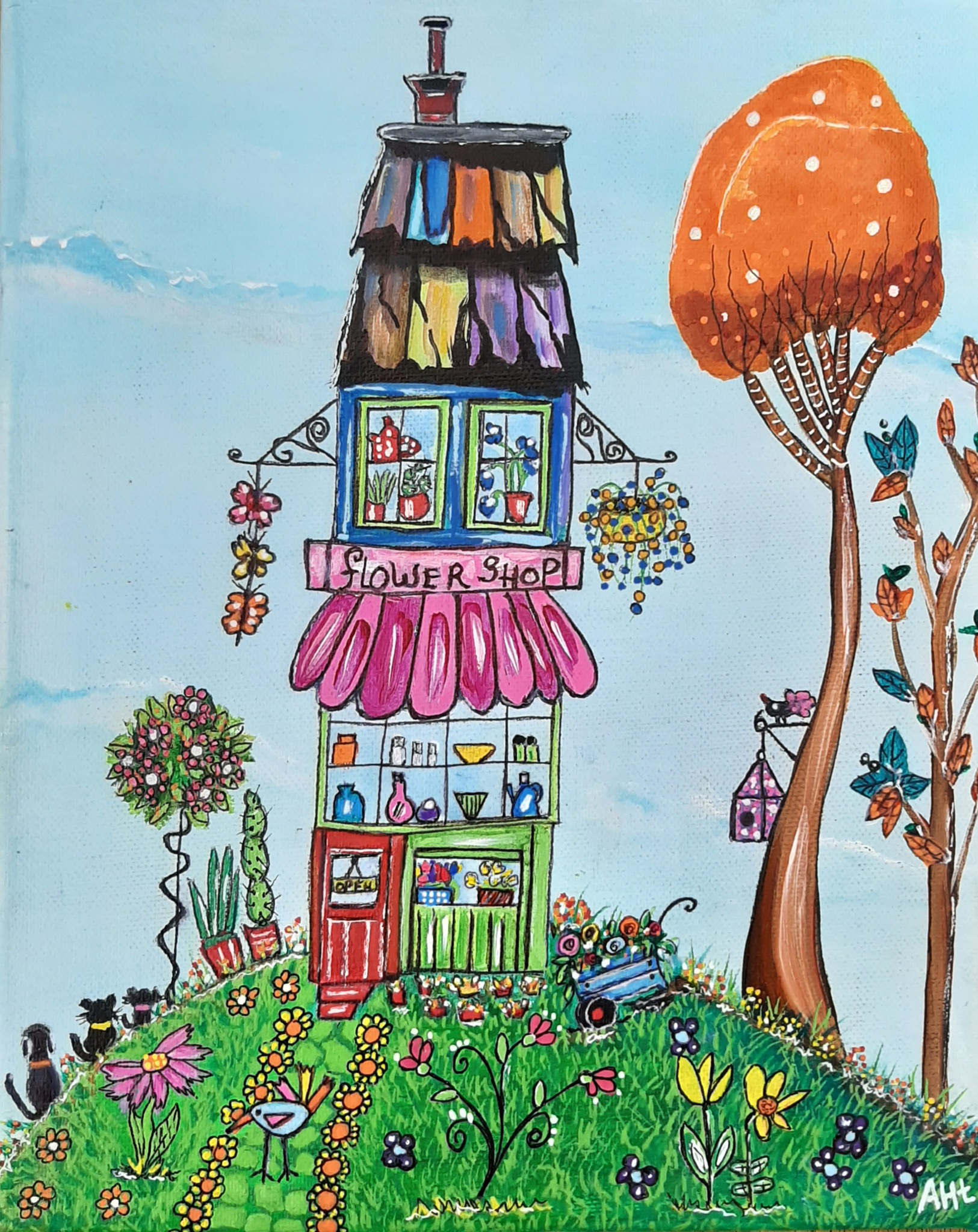 Vrolijk schilderij met een gezellige flower shop een leuk tafereeltje in kleurrijk acryl.