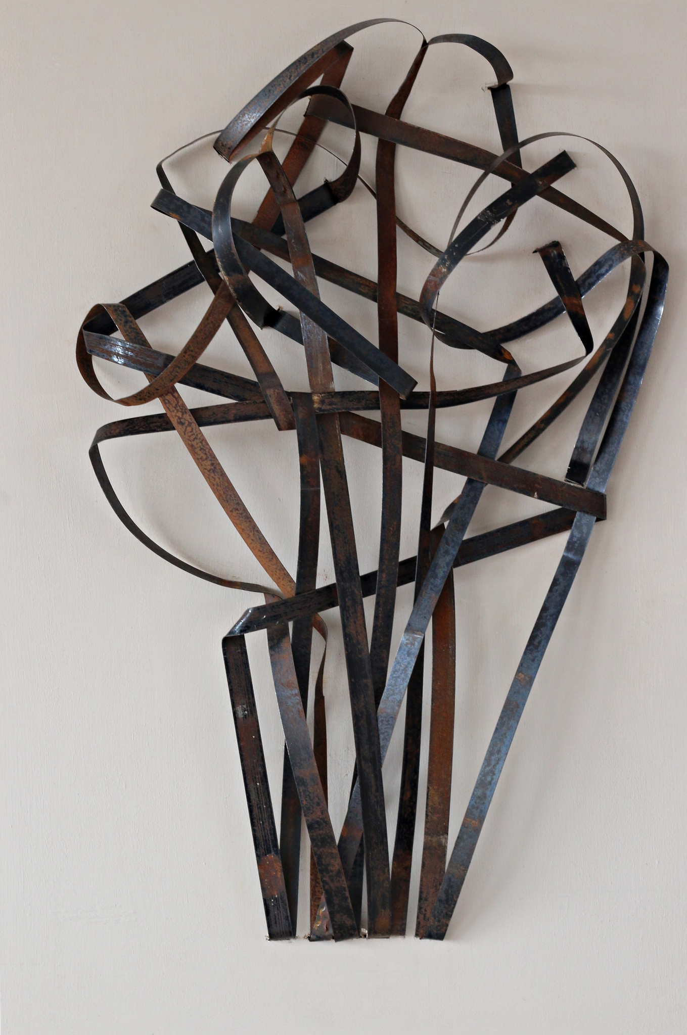 Wandobject samengesteld uit gevonden geroeste metaalstrips. Verbeeldend de Levensboom.
