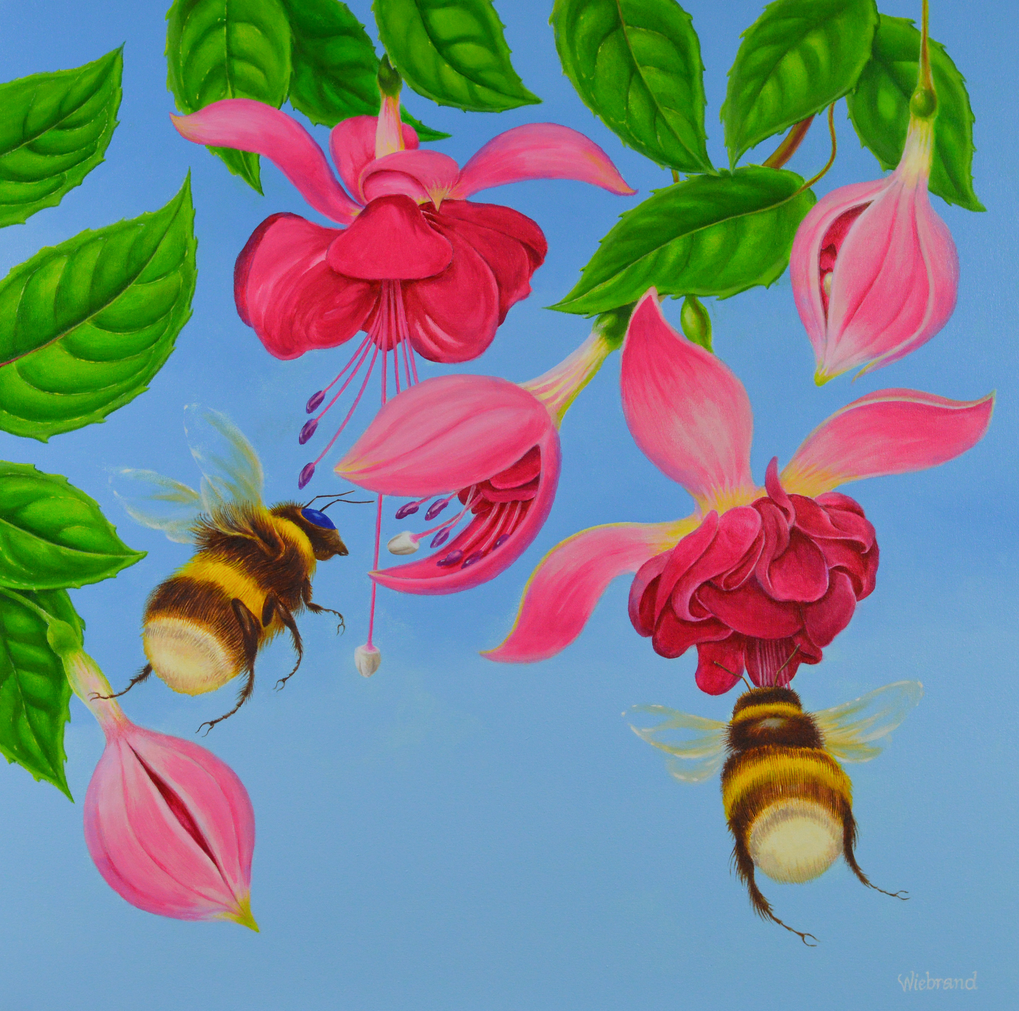 Hommels, vlinders, portretten, uitbundig bloeiende bloemen en levenslust zijn bij mij terugkerende thema’s. Soms overheerst de sereniteit, terwijl andere werken een dynamische indruk achterlaten. De boodschap die ik tracht uit te dragen is: vier het leven! De bloemen en insecten zijn rijkelijk aanwezig in mijn eigen tuin en directe omgeving. Zo zijn er meertjes, graslanden en zelfs een klein bos dichtbij. Al deze schoonheid vraagt om aandacht en verdiend het om geschilderd te worden.