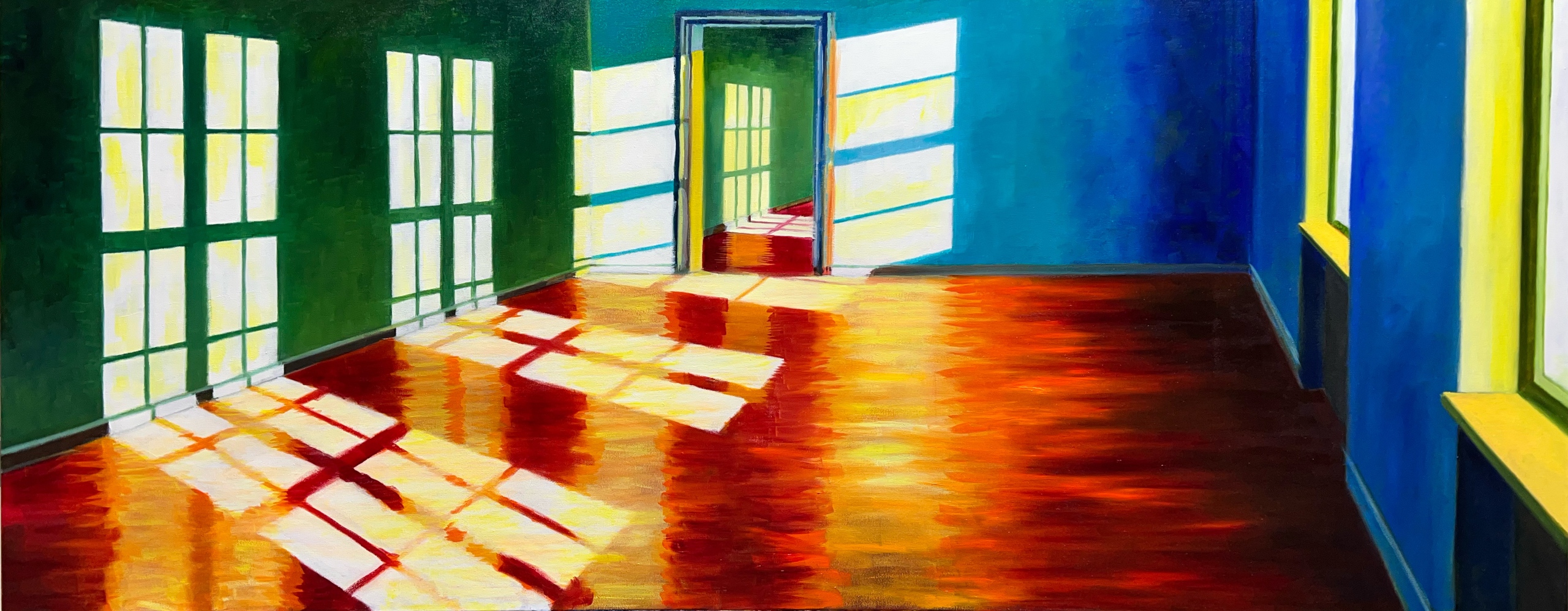 Olieverf Schilderij Kleurrijk Zonlicht Komorebi Japan Gouden Uur Golden Hour Spiegelingen Reflectie Groen Rood Ochtendlicht Avondlicht Sasart Sasjabork Minerva Groningen Noordelijk Realisme Sfeer Intiem Ruimte