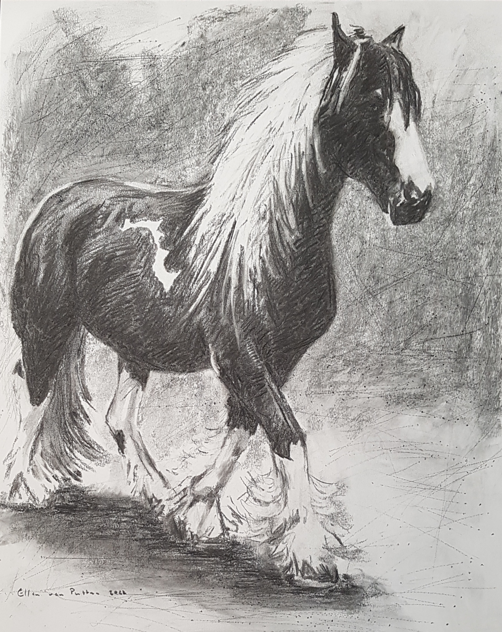 Moon Shadow - het mooie Tinkerpaard uit Tjerkwerd - houtskool op papier in opdracht