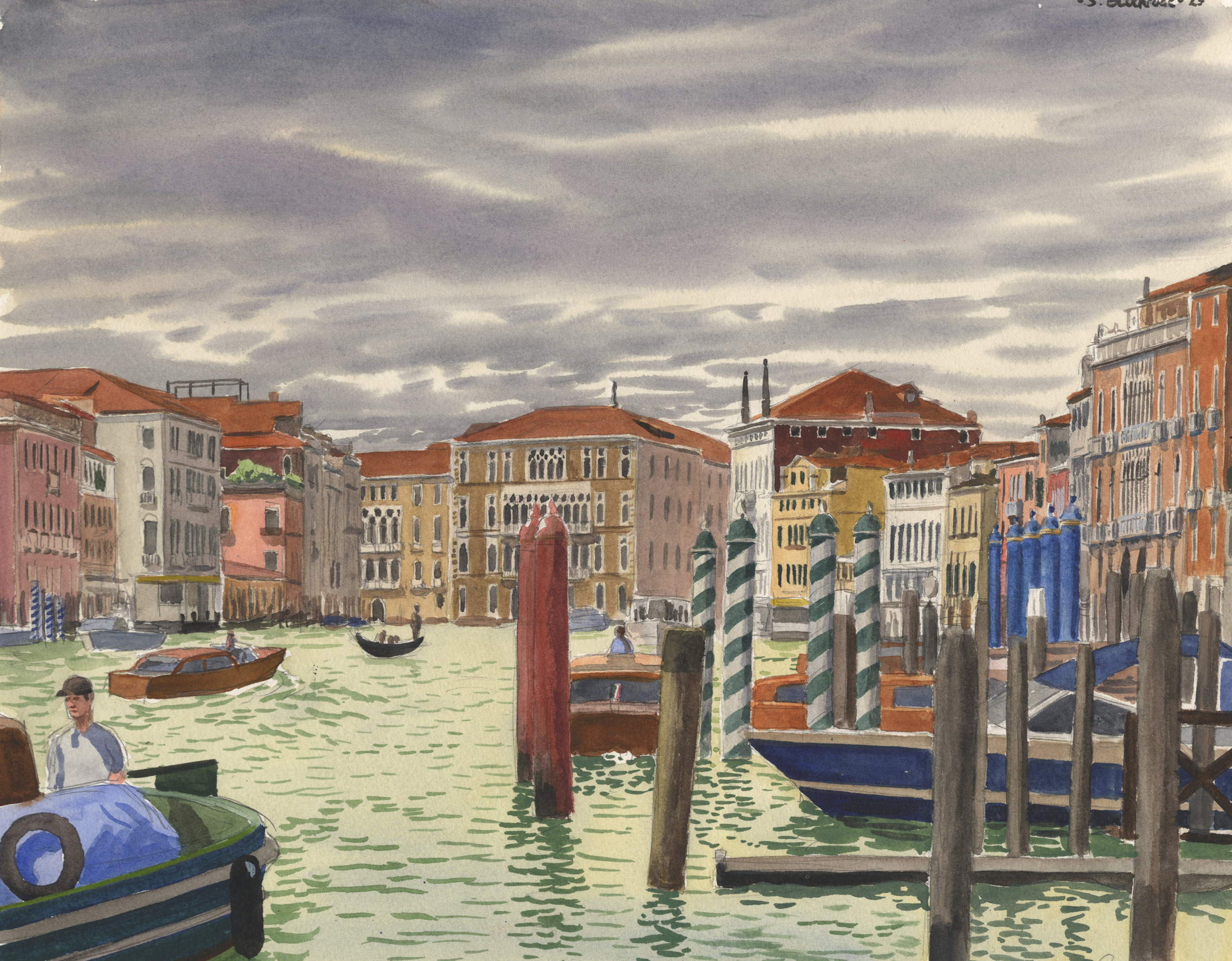 Het Canal Grande in Venetië op een bewolkte ochtend. Vanaf de vaporetto halte San Silvestro kijken we in de richting van de bocht bij het Ca' Foscari. Dit werkje is geheel plein air geschilderd.