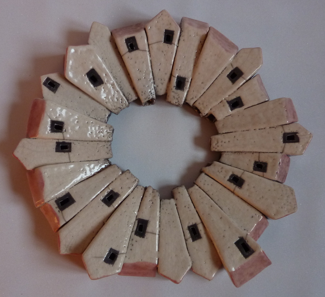 Kleine huisjes in het rond geplaatst. Object voor aan de muur. Raku gestookt.