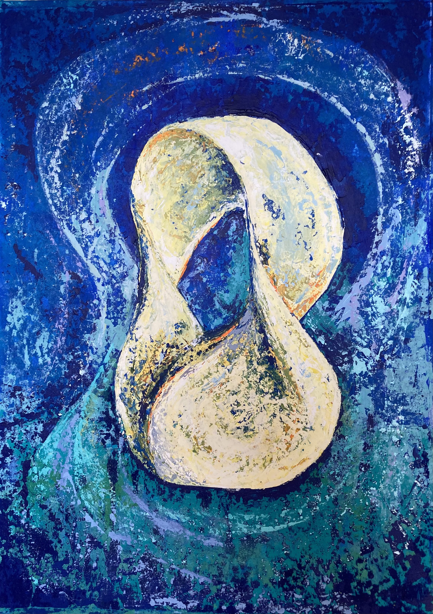 Schilderen met acryl en paletmes. Meeste schilderijen ontstaan vanuit innerlijk beeld, indruk of tekst.