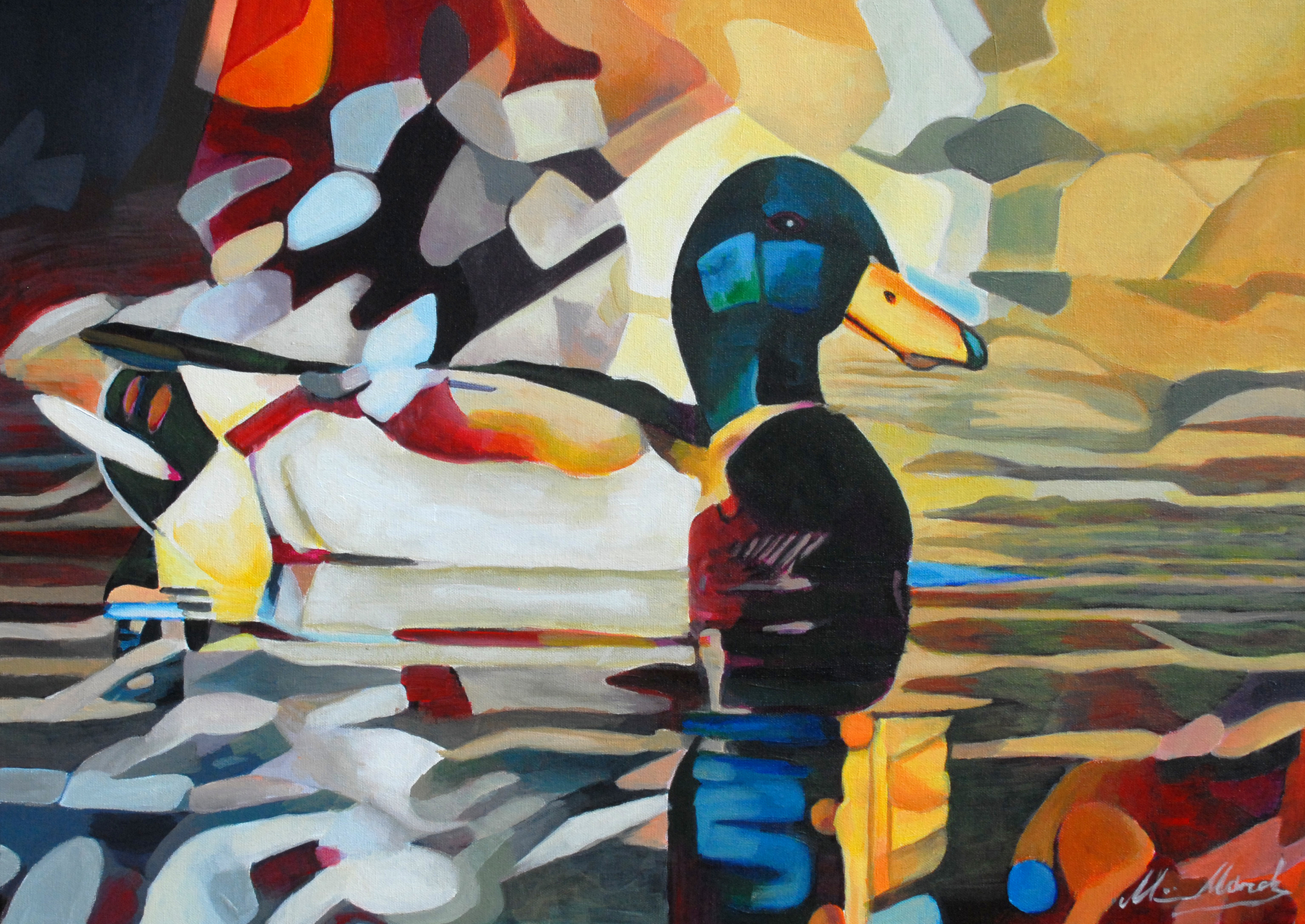 Schilderij van een wilde mannetjeseend op het water. Het werk is in zijn geheel opgebouwd uit afzonderlijke geabstraheerde geometrische vormen.