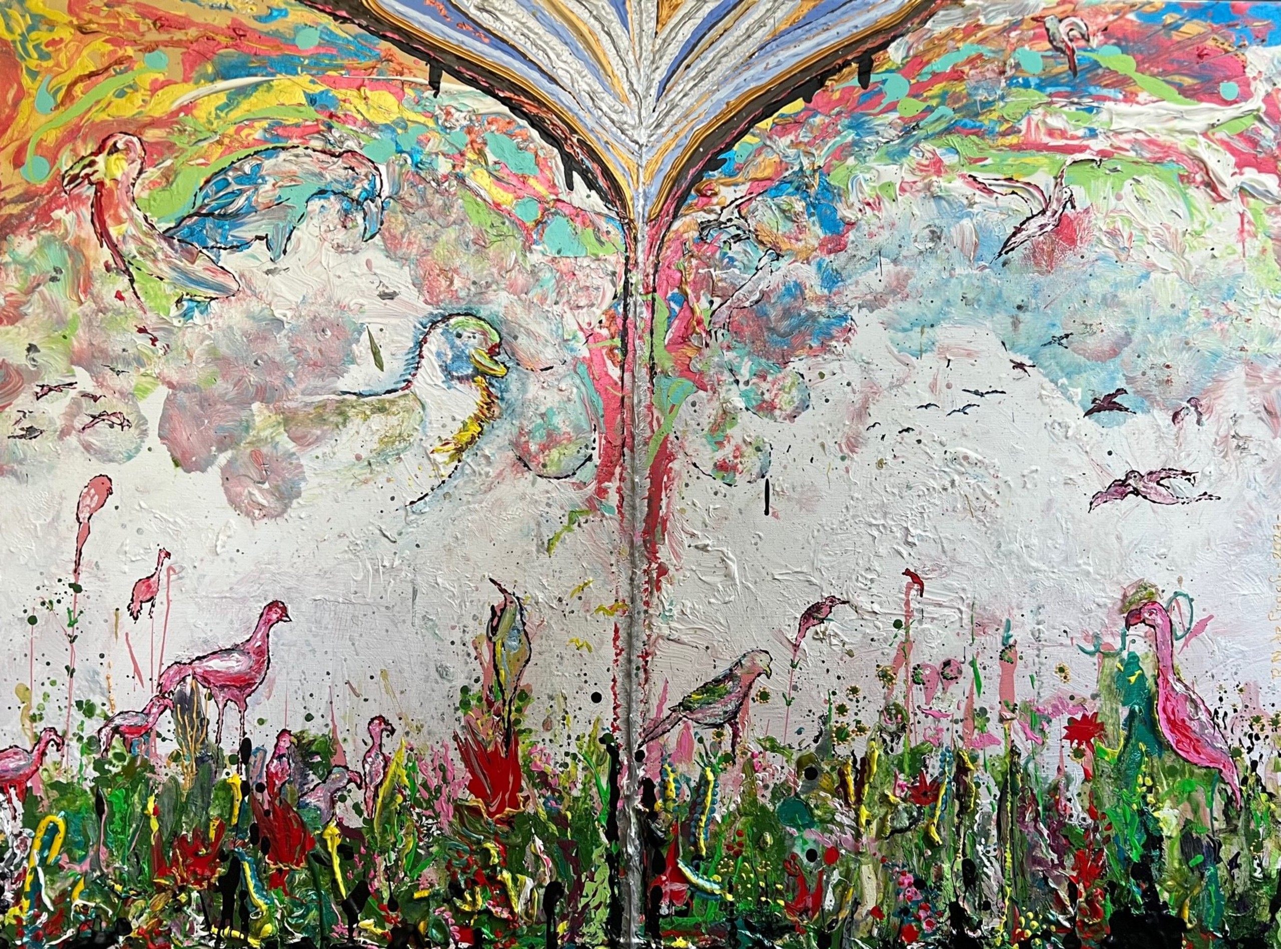 Dit schilderij is op een heel bijzondere manier ontstaan. Het heeft een aantal stadia doorstaan. Meestal begin ik met verven vanuit mijn fantasie en dan ontstaat er een beeld in mijn hoofd waar ik dan op verder borduur. Bij het maken van dit schilderij had ik dat niet, tot op het punt dat ik een soort van vogel vormpjes begon te zien in de verf. Ik ben extra vogeltjes gaan toevoegen en dit is het resultaat. Gedurende deze zoektocht zijn er veel vogel vormen en fantasierijke vogels ontstaan. Dit is een soort schepping welke uit mijn eigen creatieve geest is voort gekomen.