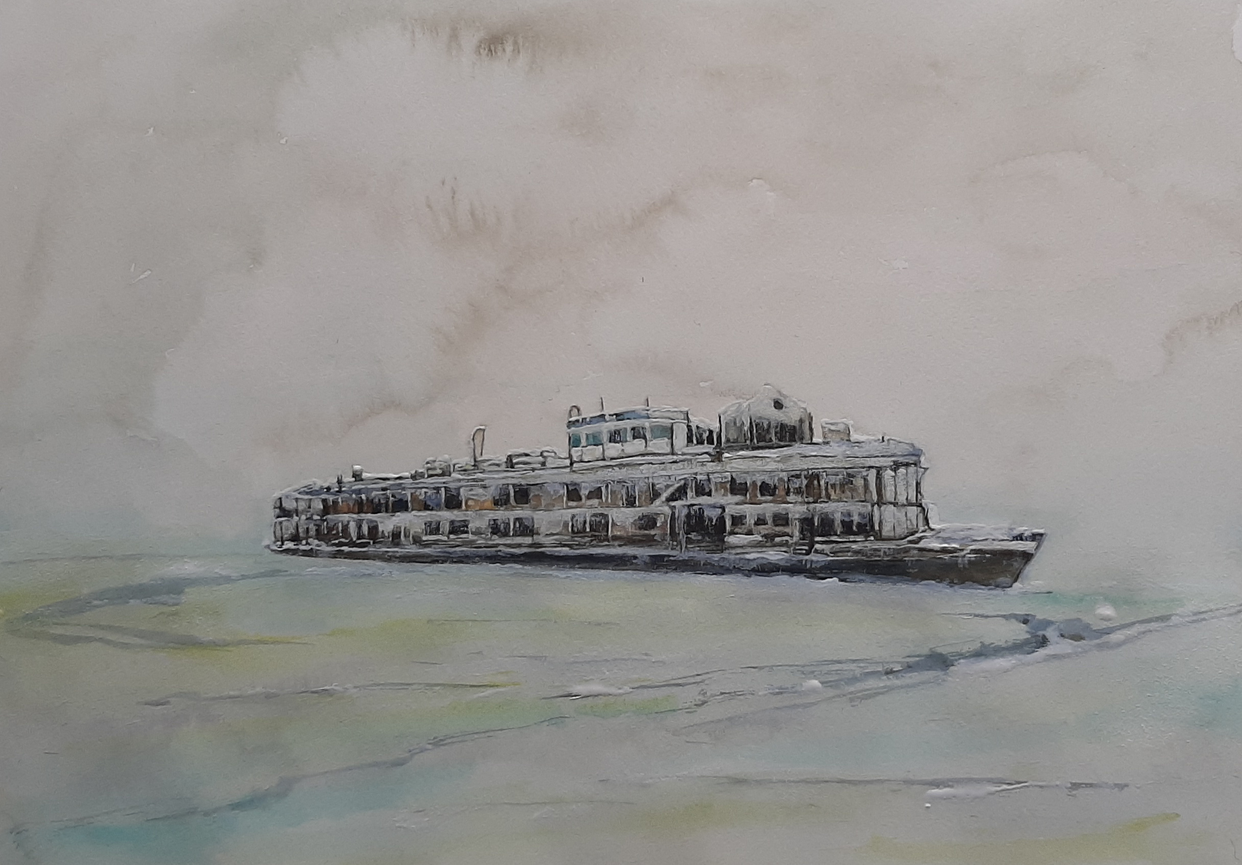 Gezonken cruiseschip Bulgaria, in de republiek Tatarstan, Rusland. De Bulgaria werd later boven water getakeld. Er bevonden zich nog 122 lijken aan boord. Het aquarel is geschilderd naar de foto van de Russische fotograaf Danila Tkatchenko. Het werk maakt deel uit van zijn serie RESTRICTED AREAS. Danila Tkachenko (Moskou, 1989) studeerde af aan de Rodchenko Moskou School of Photography and Multimedia, afdeling documentaire fotografie. In maart 2015 beëindigde hij het hier getoonde project ‘Restricted Areas’, dat al een aantal internationale onderscheidingen ontving, waaronder de European Publishers Award voor fotografie en de Burn Magazine Grant. De foto’s tonen bijzondere technologische, architectonische en culturele overblijfselen van de voormalige Sovjet-Unie. Tkachenko fotografeerde ze op voormalige militaire bases of locaties voor ruimtevaarttechnologie of nucleaire testen, onvindbaar op de kaart. Restricted Areas is in 2016 is ook als boek verschenen.