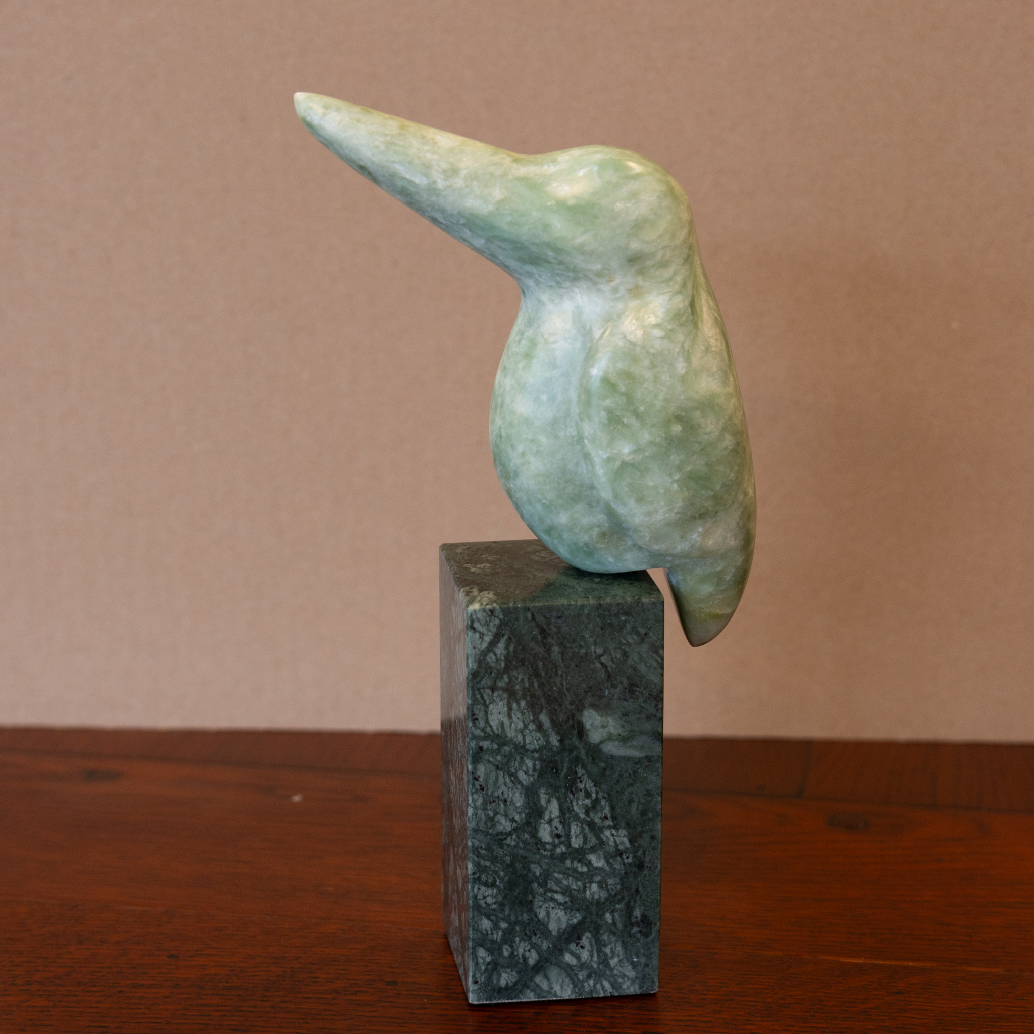 turquoise indiaans speksteen ijsvogeltje op sokkel van groen marmer.
